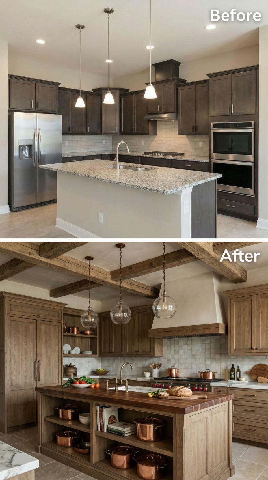 Exposed reclaimed wood beams and rich walnut cabinetry completely reimagine this builder-grade kitchen for happy people into a welcoming farmhouse haven. Glass globe pendants replace basic fixtures while open shelving showcases copper cookware and natural accessories. The butcher block island countertop and integrated storage create both functionality and rustic charm that transforms everyday cooking into a joyful experience.