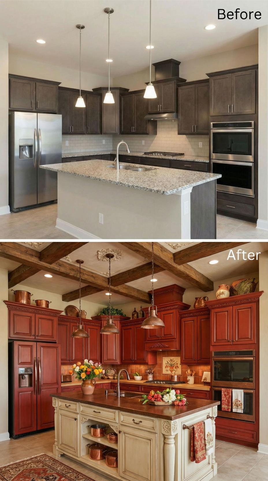 Rich cherry wood cabinetry replaces bland gray-brown builder-grade units, transforming sterile functionality into Mediterranean warmth. Exposed wooden ceiling beams add architectural character while copper pendant lights cast golden glows across granite countertops. The cream-painted island creates beautiful contrast against burgundy perimeter cabinets, while decorative pottery and copper cookware showcase personal style that was completely absent before.