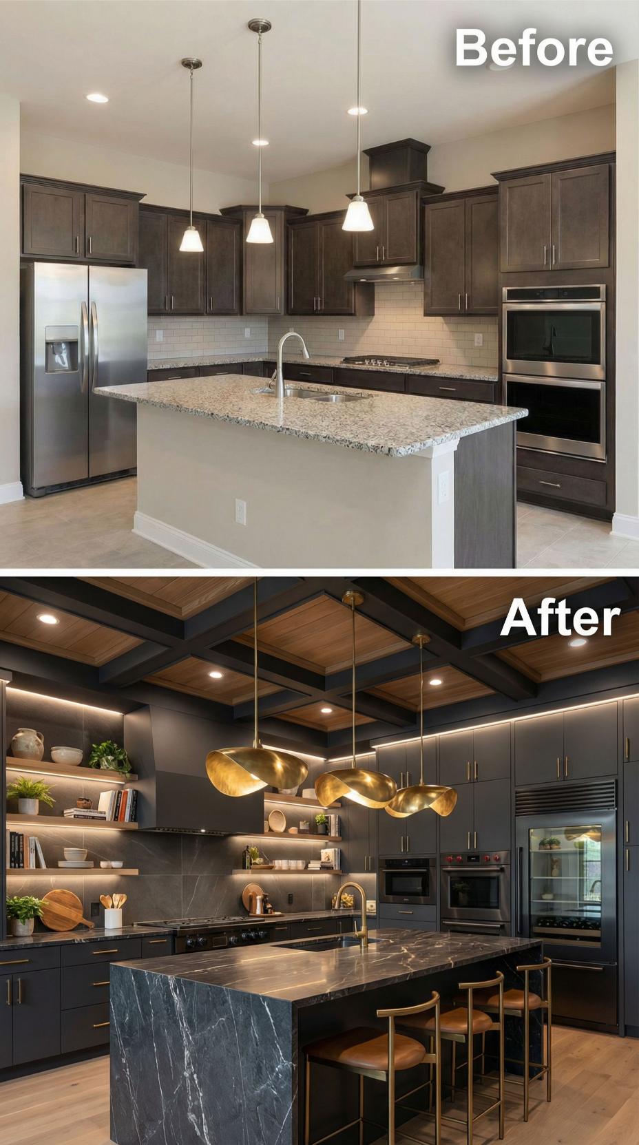 Dark cabinetry replaces basic brown units while an extraordinary coffered ceiling with rich wood planks transforms the entire space. Floating shelves eliminate upper cabinets on one wall, creating an open gallery for dishes and books. The marble waterfall island anchors the room with sophisticated veining, while brass sculptural pendants and under-cabinet lighting add warmth to the moody palette.