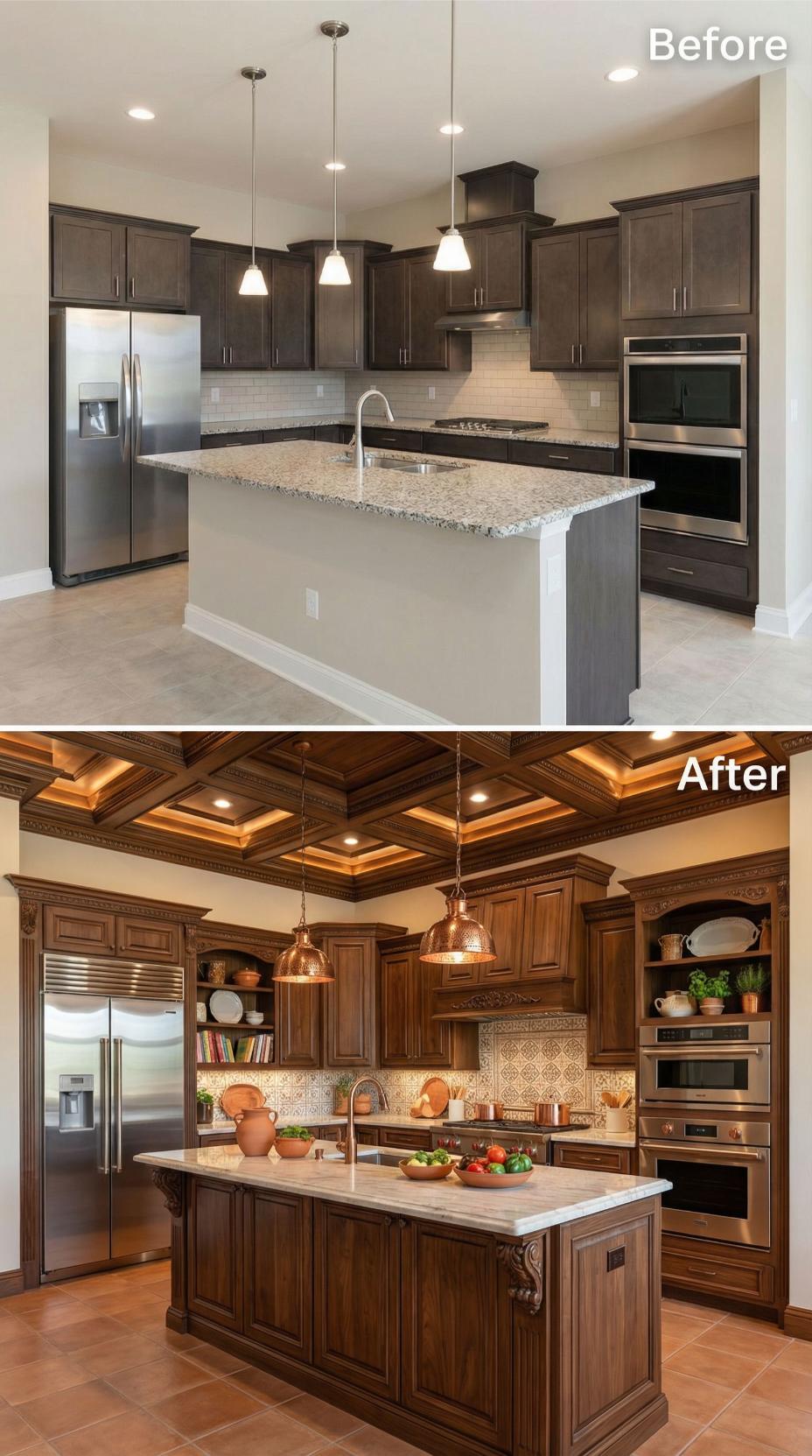 Intricate coffered ceilings and rich walnut cabinetry transform this Builder-grade Kitchen for Happy People into a sophisticated culinary haven. Hand-carved details adorn the island base while decorative tile backsplash patterns create visual interest. Copper pendant lights cast warm illumination over terra cotta flooring, replacing stark simplicity with timeless Mediterranean charm that elevates everyday cooking into an artisanal experience.