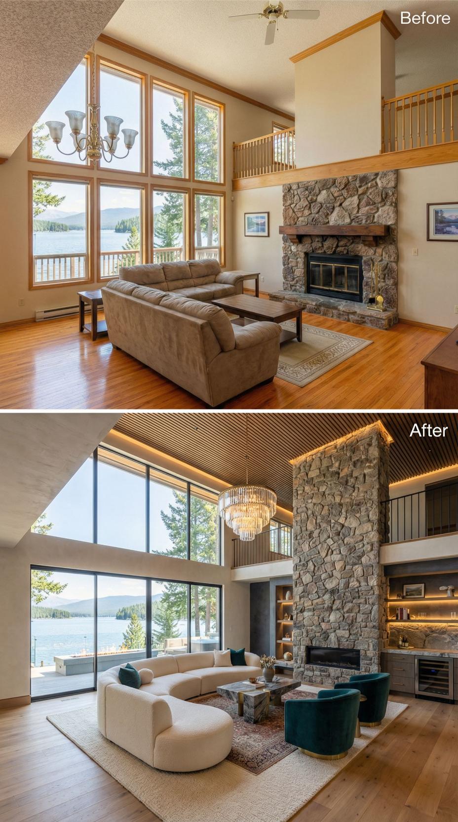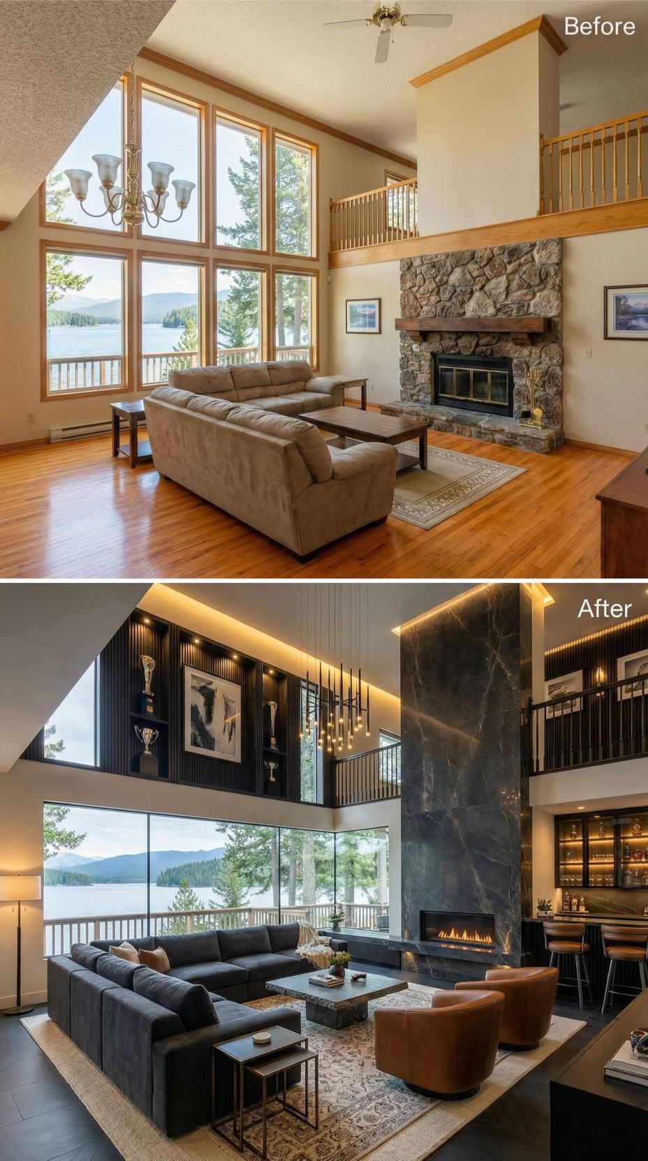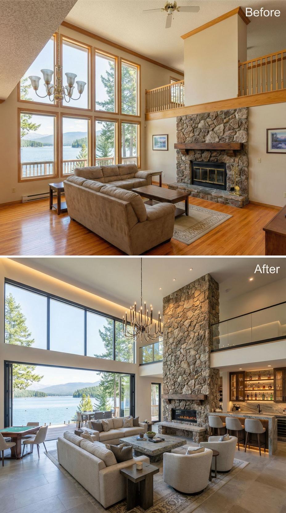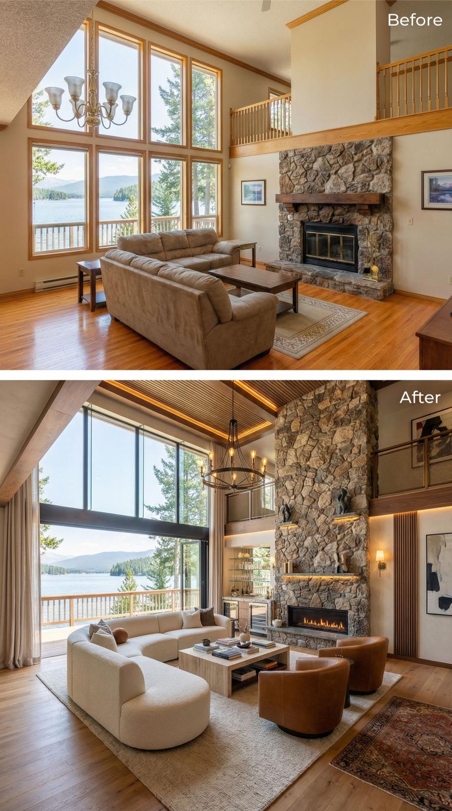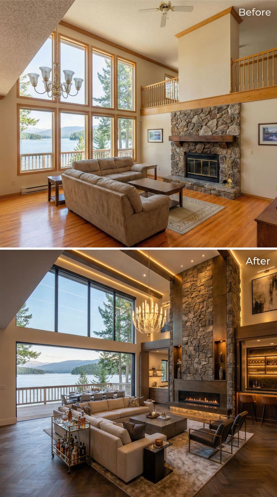 Our lakeside cabinโs great room view was doing Olympic-level work while the space itself brought a beige participation ribbon. Two stories of glass, mountains in the distance, and an interior that still read like a showroom that forgot to arrive. This gallery of renovation ideas corrects the mismatch with bold, high-design makeovers: fireplaces that command attention, lighting that acts like architecture, and furniture plans that stop floating in space and start living for the view.