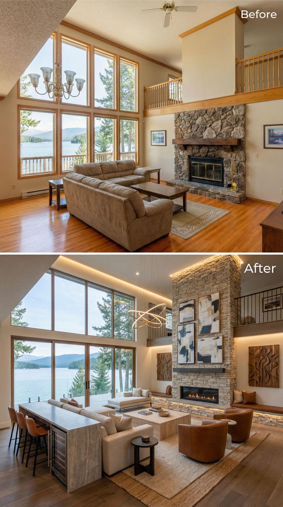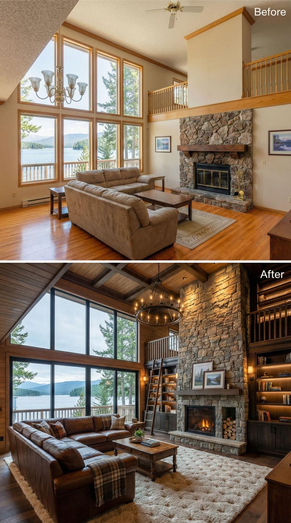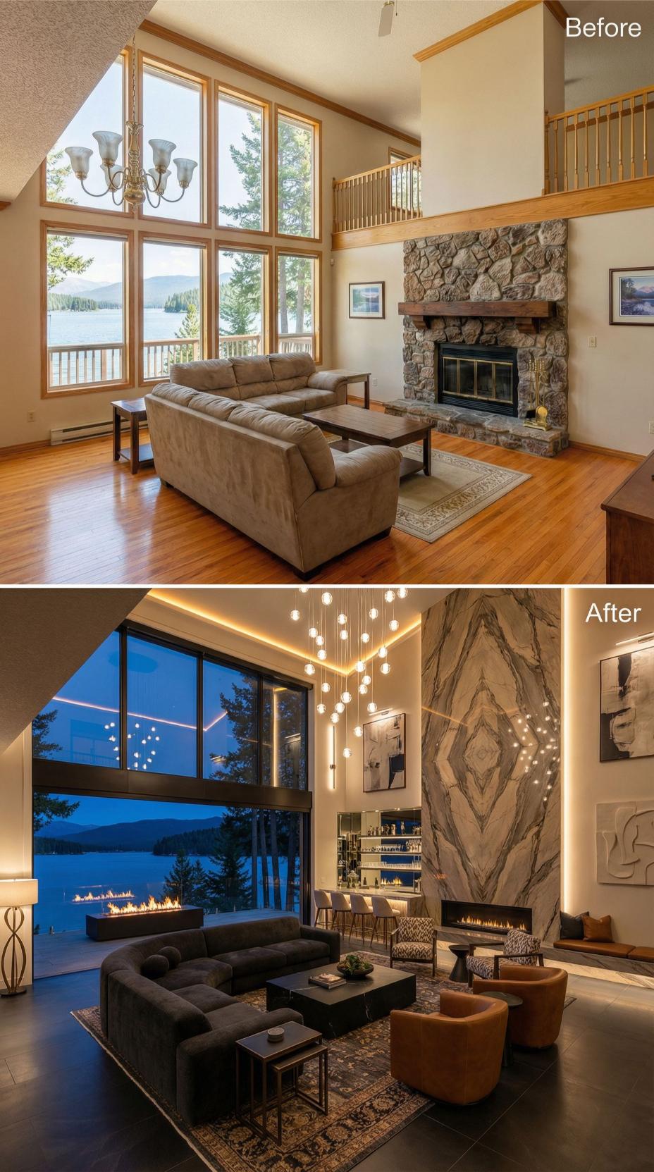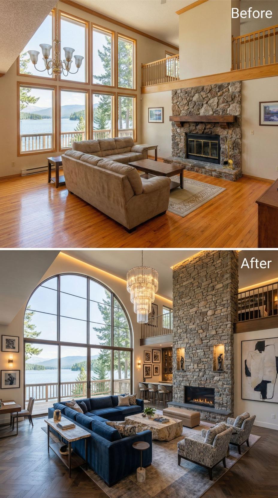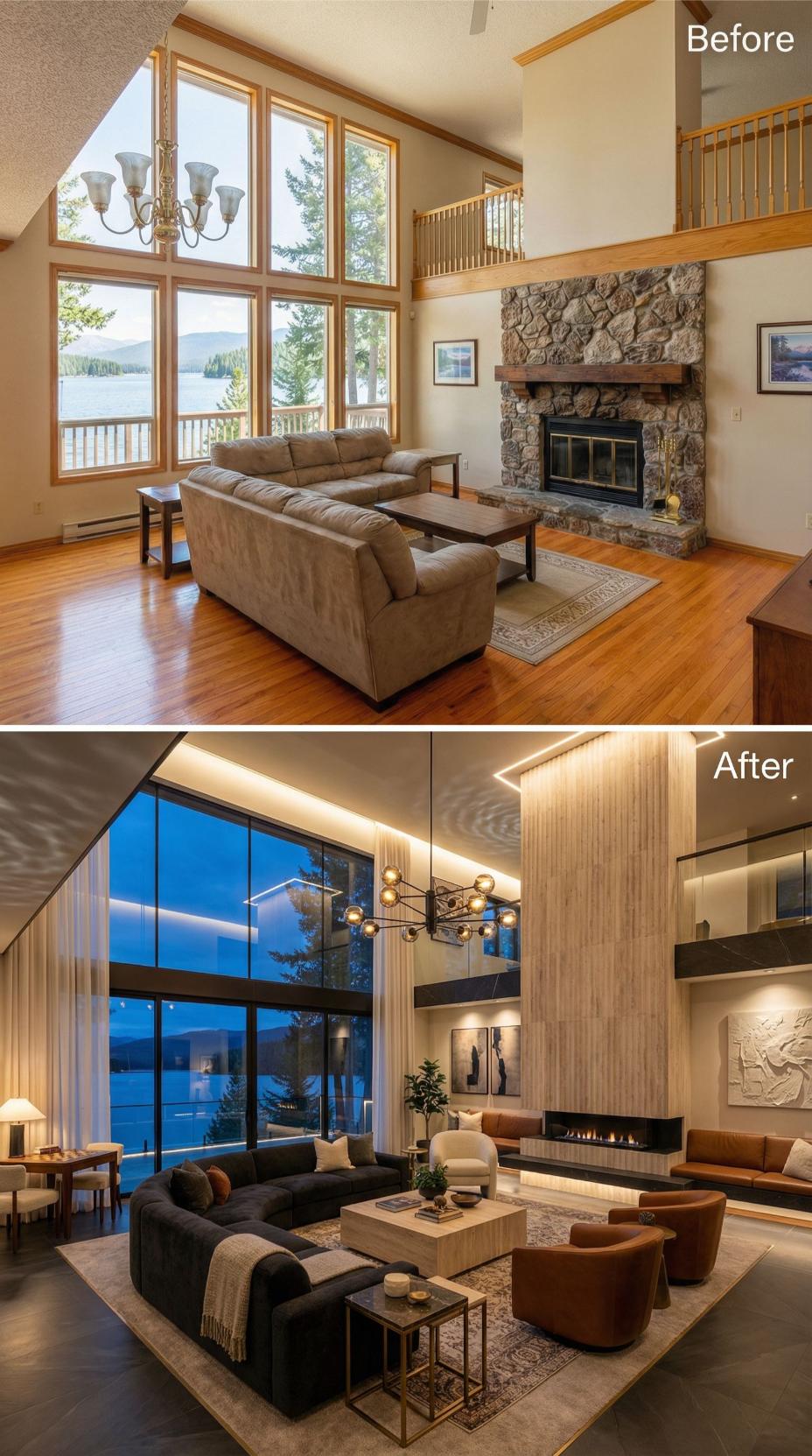 Our lakeside cabinโs great room view was doing Olympic-level work while the space itself brought a beige participation ribbon. Two stories of glass, mountains in the distance, and an interior that still read like a showroom that forgot to arrive. This gallery of renovation ideas corrects the mismatch with bold, high-design makeovers: fireplaces that command attention, lighting that acts like architecture, and furniture plans that stop floating in space and start living for the view.