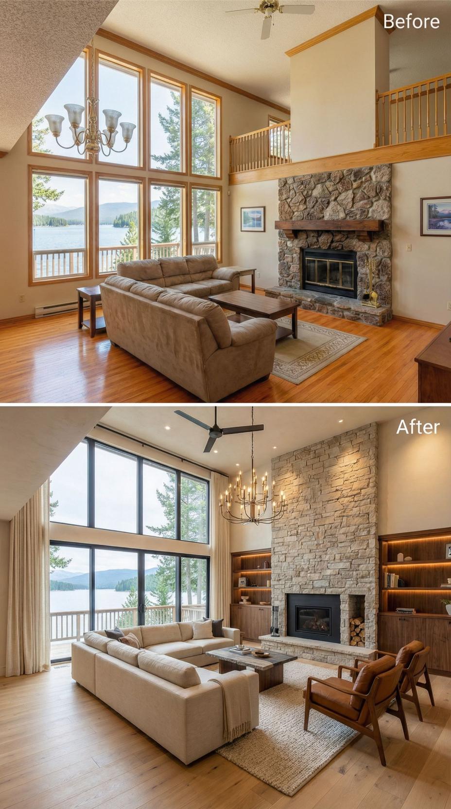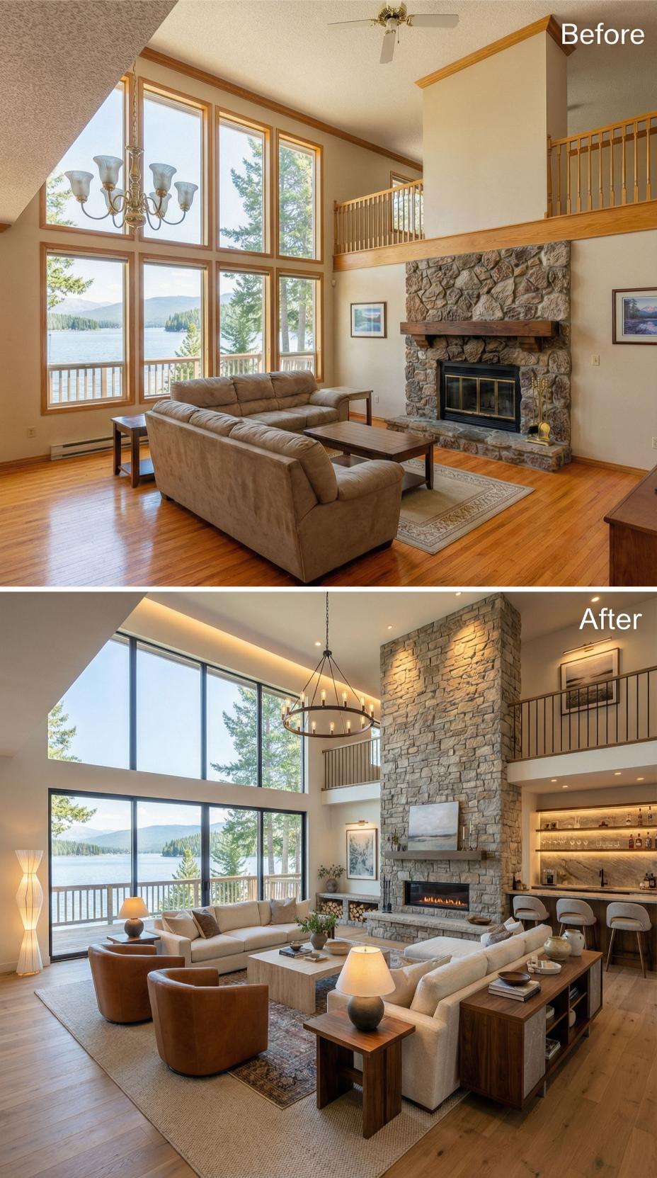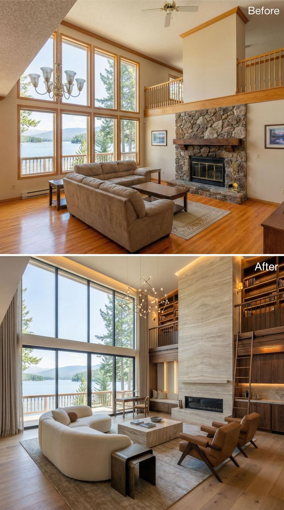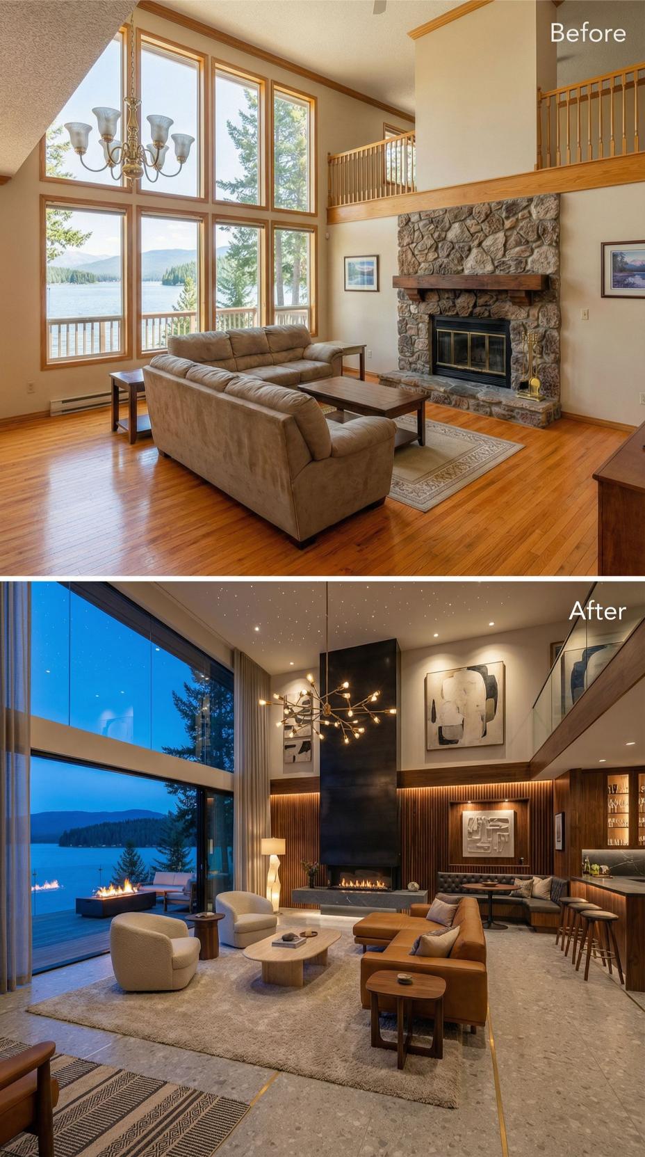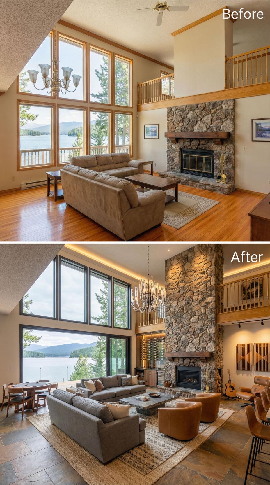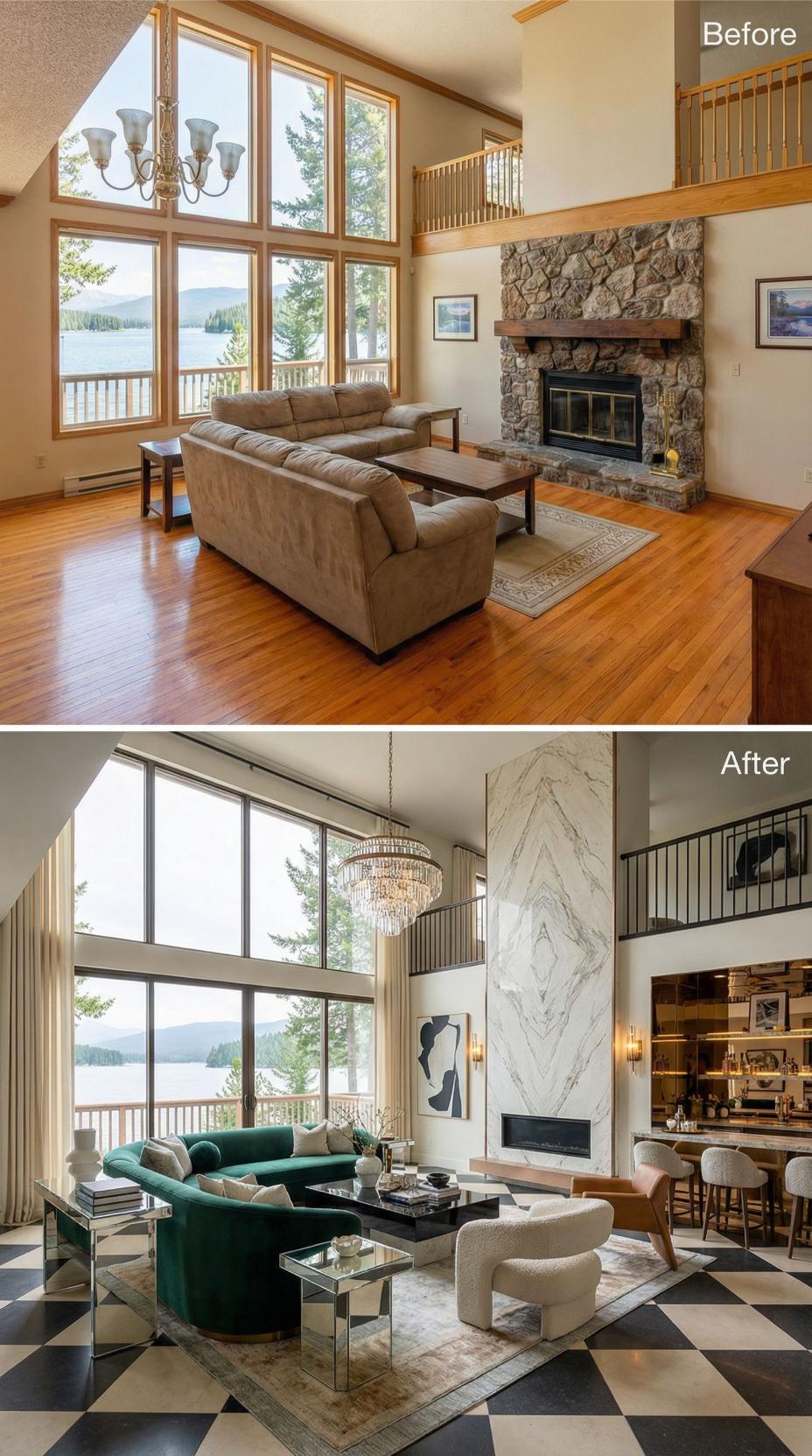 Our lakeside cabinโs great room view was doing Olympic-level work while the space itself brought a beige participation ribbon. Two stories of glass, mountains in the distance, and an interior that still read like a showroom that forgot to arrive. This gallery of renovation ideas corrects the mismatch with bold, high-design makeovers: fireplaces that command attention, lighting that acts like architecture, and furniture plans that stop floating in space and start living for the view.