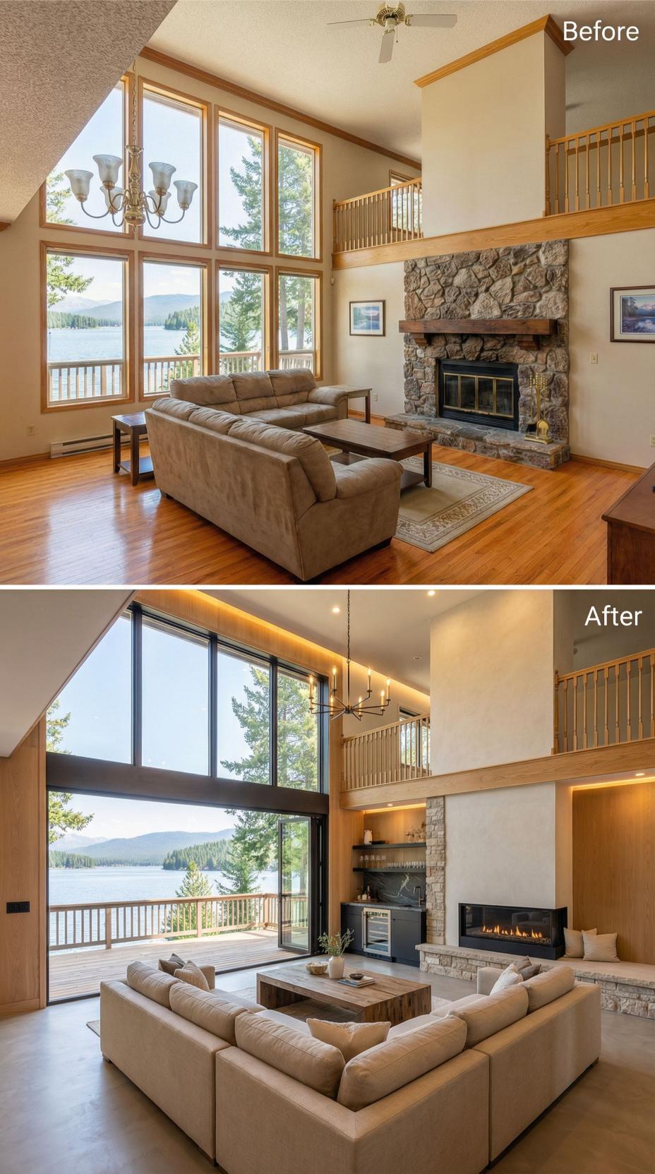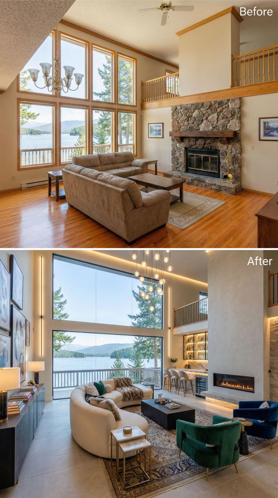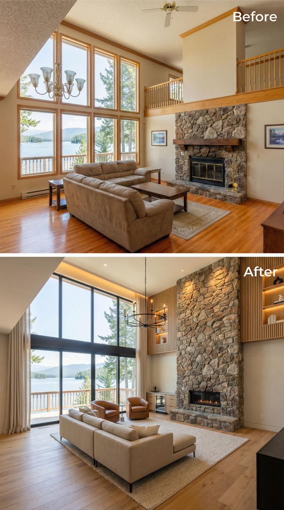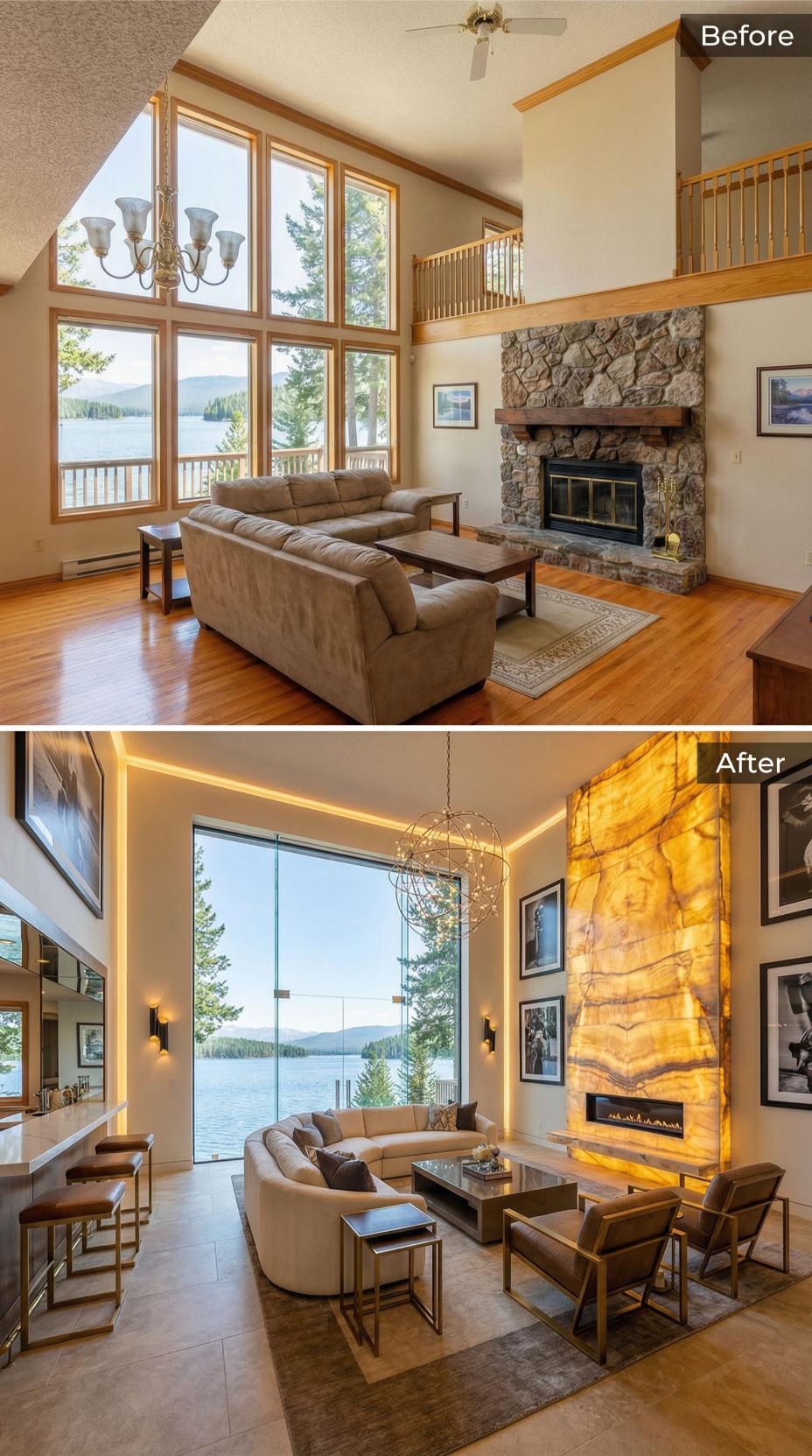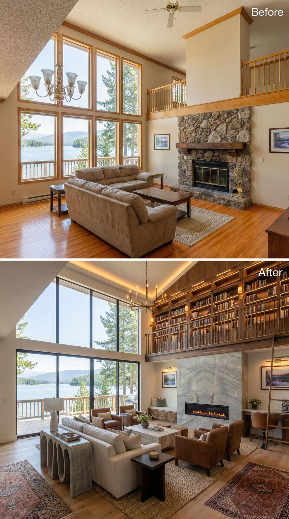 Our lakeside cabinโs great room view was doing Olympic-level work while the space itself brought a beige participation ribbon. Two stories of glass, mountains in the distance, and an interior that still read like a showroom that forgot to arrive. This gallery of renovation ideas corrects the mismatch with bold, high-design makeovers: fireplaces that command attention, lighting that acts like architecture, and furniture plans that stop floating in space and start living for the view.