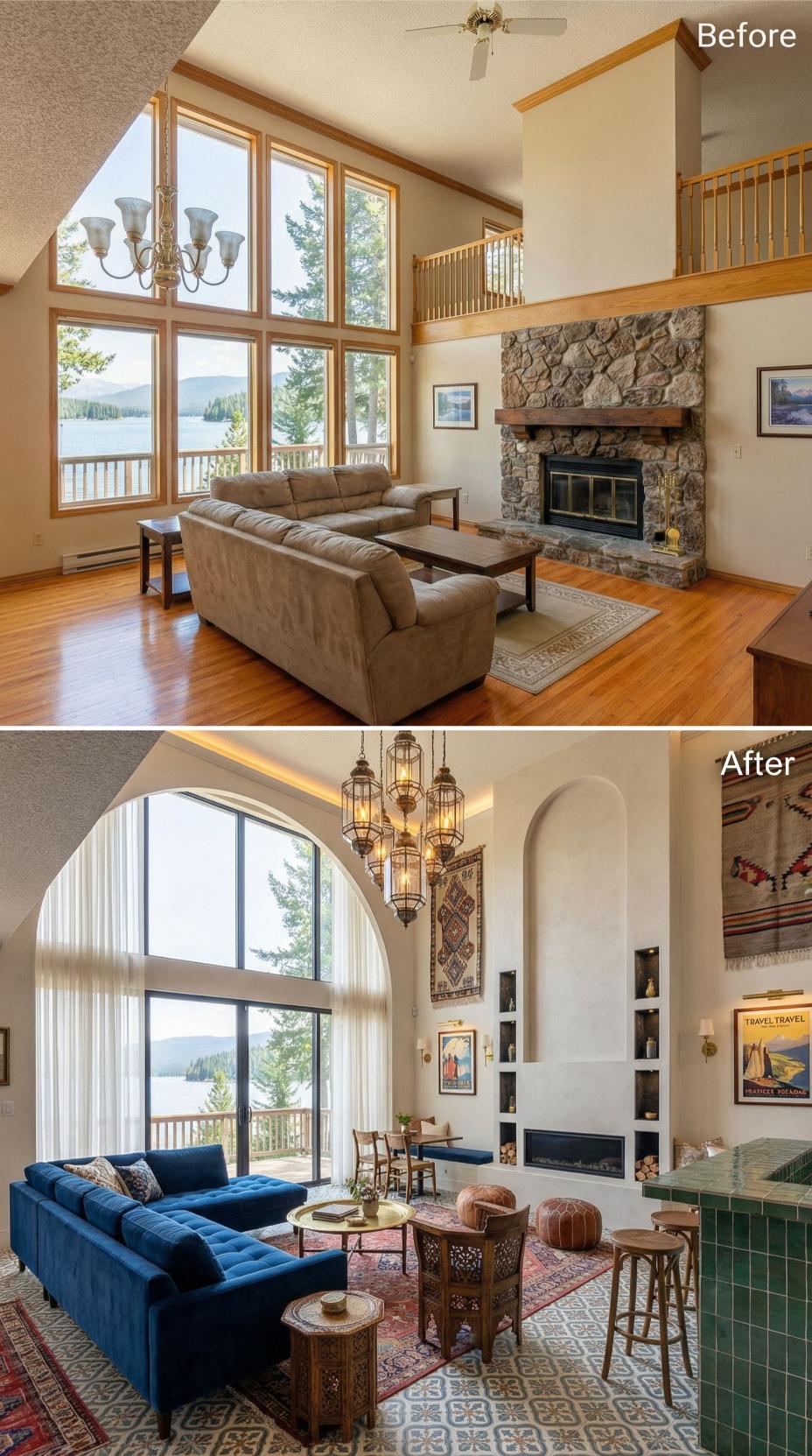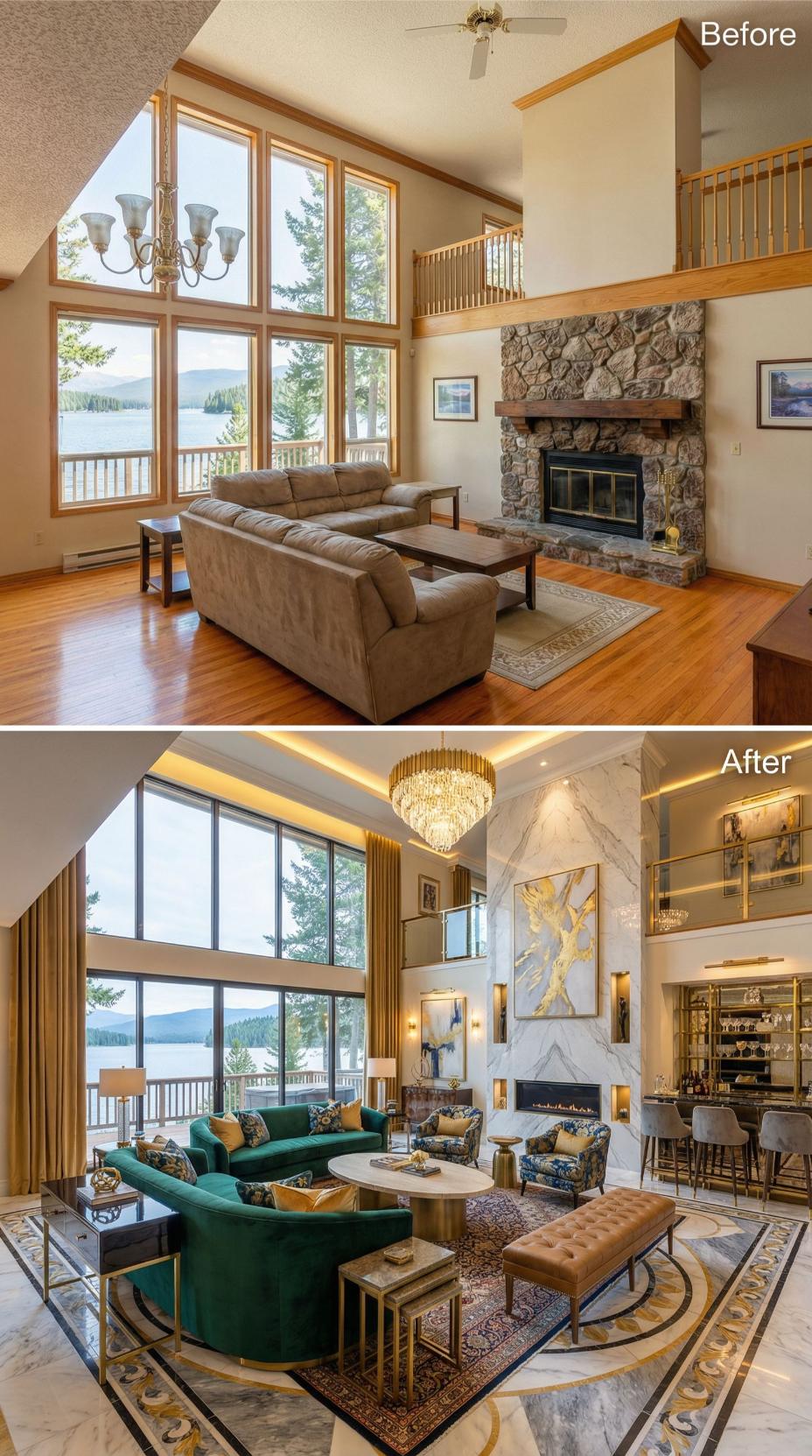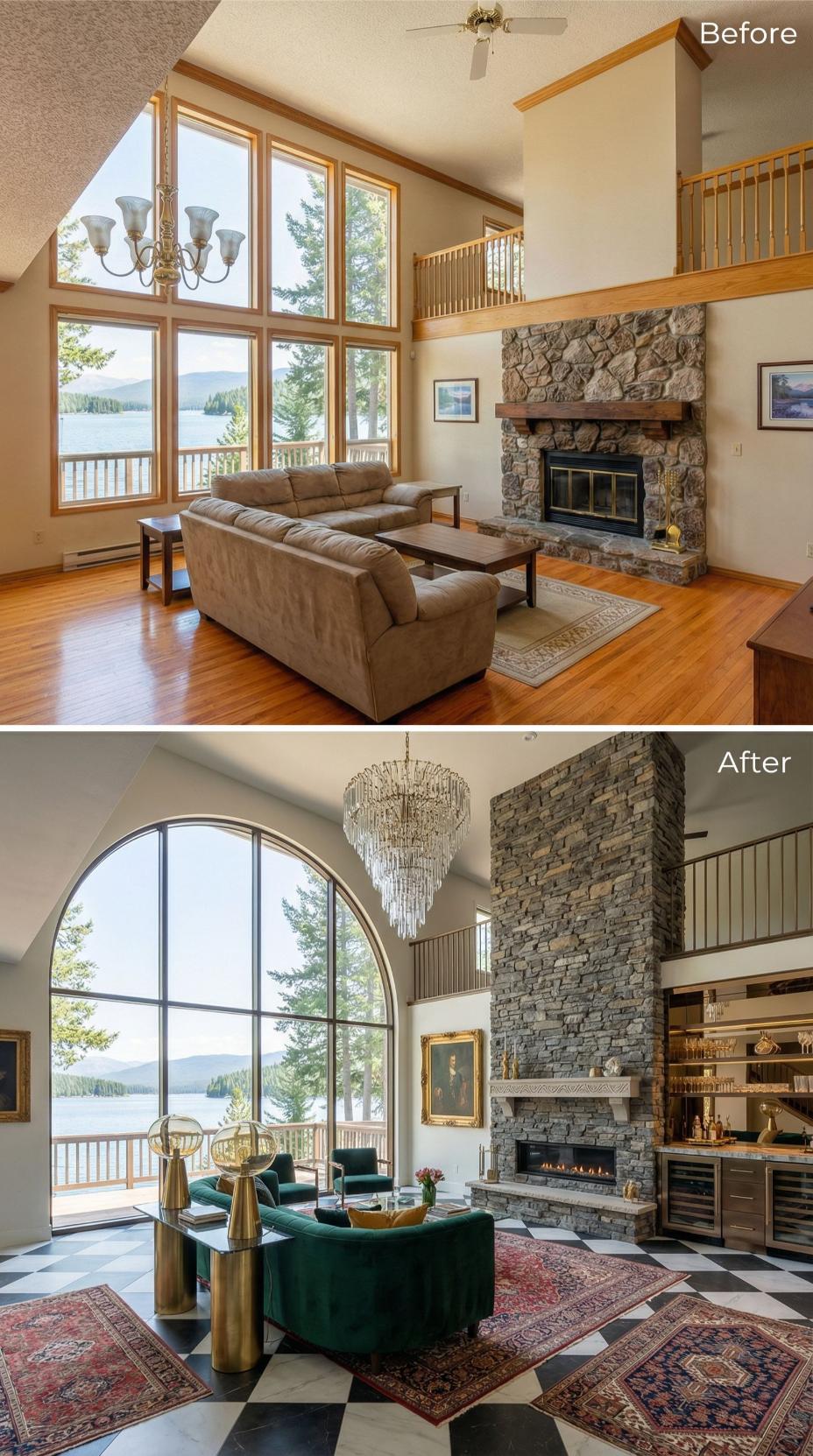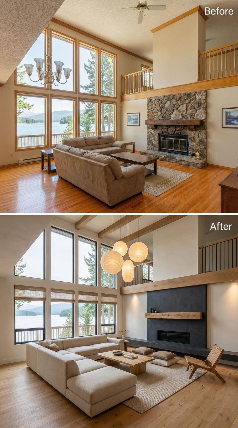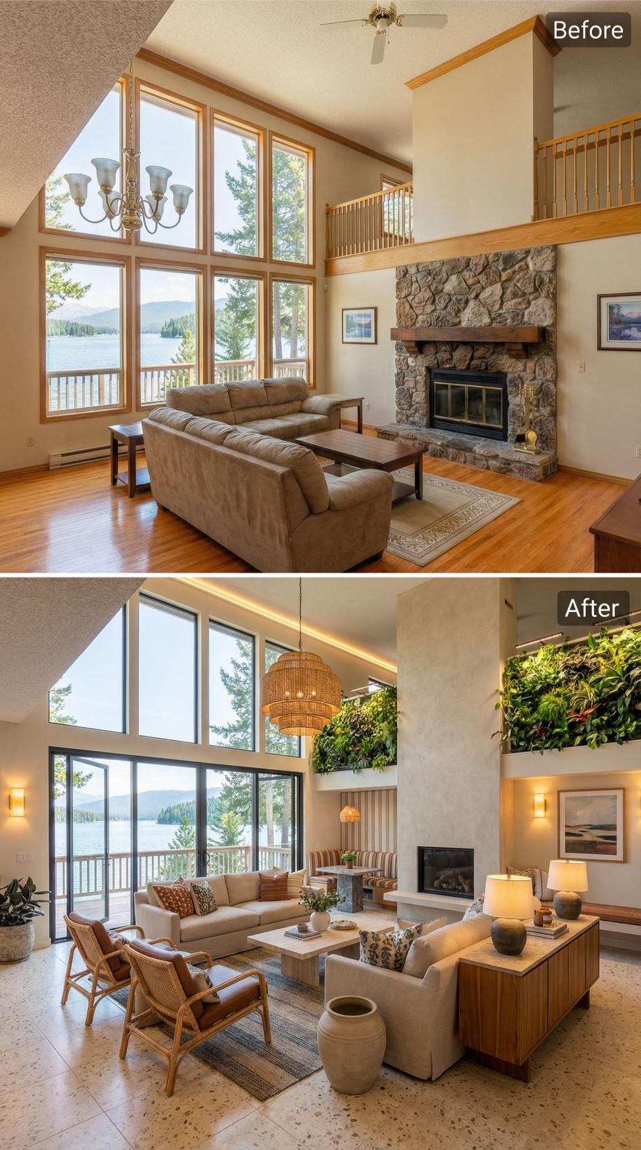 Our lakeside cabinโs great room view was doing Olympic-level work while the space itself brought a beige participation ribbon. Two stories of glass, mountains in the distance, and an interior that still read like a showroom that forgot to arrive. This gallery of renovation ideas corrects the mismatch with bold, high-design makeovers: fireplaces that command attention, lighting that acts like architecture, and furniture plans that stop floating in space and start living for the view.