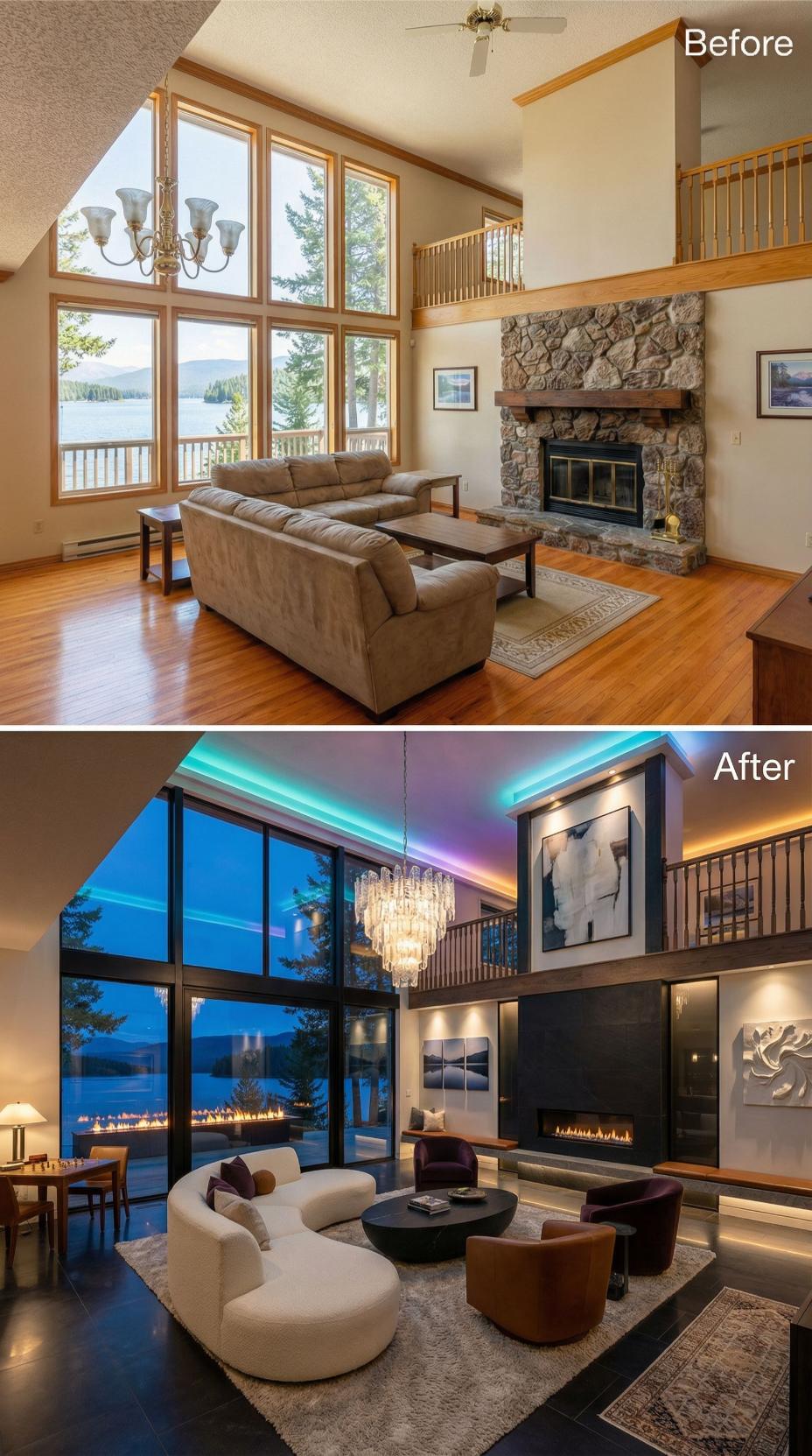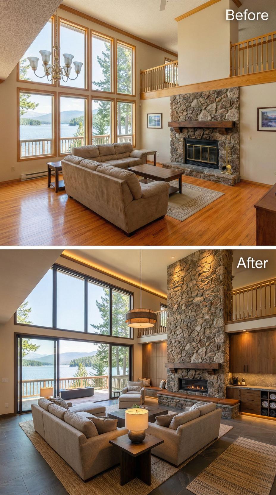 Dramatic black metal transforms this builder grade great roomโs chunky stone fireplace into a stunning contemporary focal point. Floor-to-ceiling windows now showcase unobstructed lake views while integrated LED lighting creates sophisticated ambiance. Modern sectional seating and a sculptural pendant light complete the luxurious transformation from dated cabin style to refined mountain retreat.