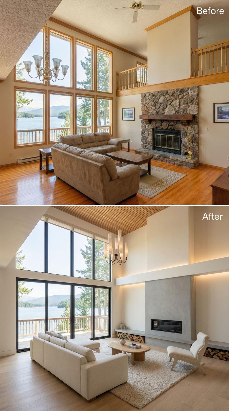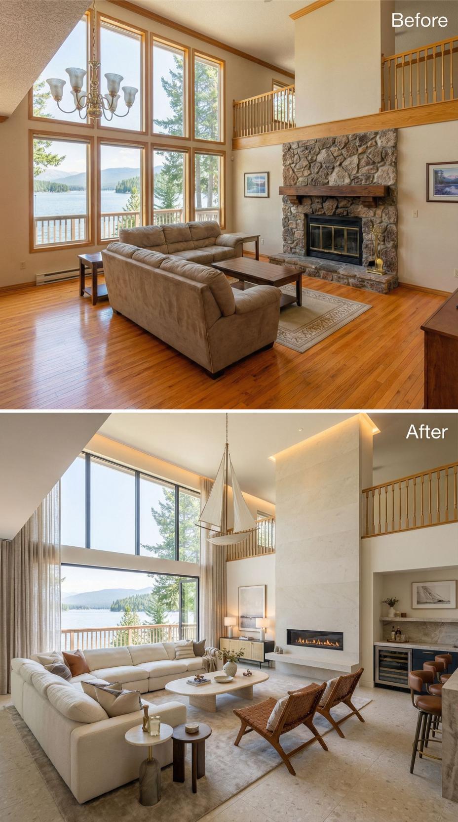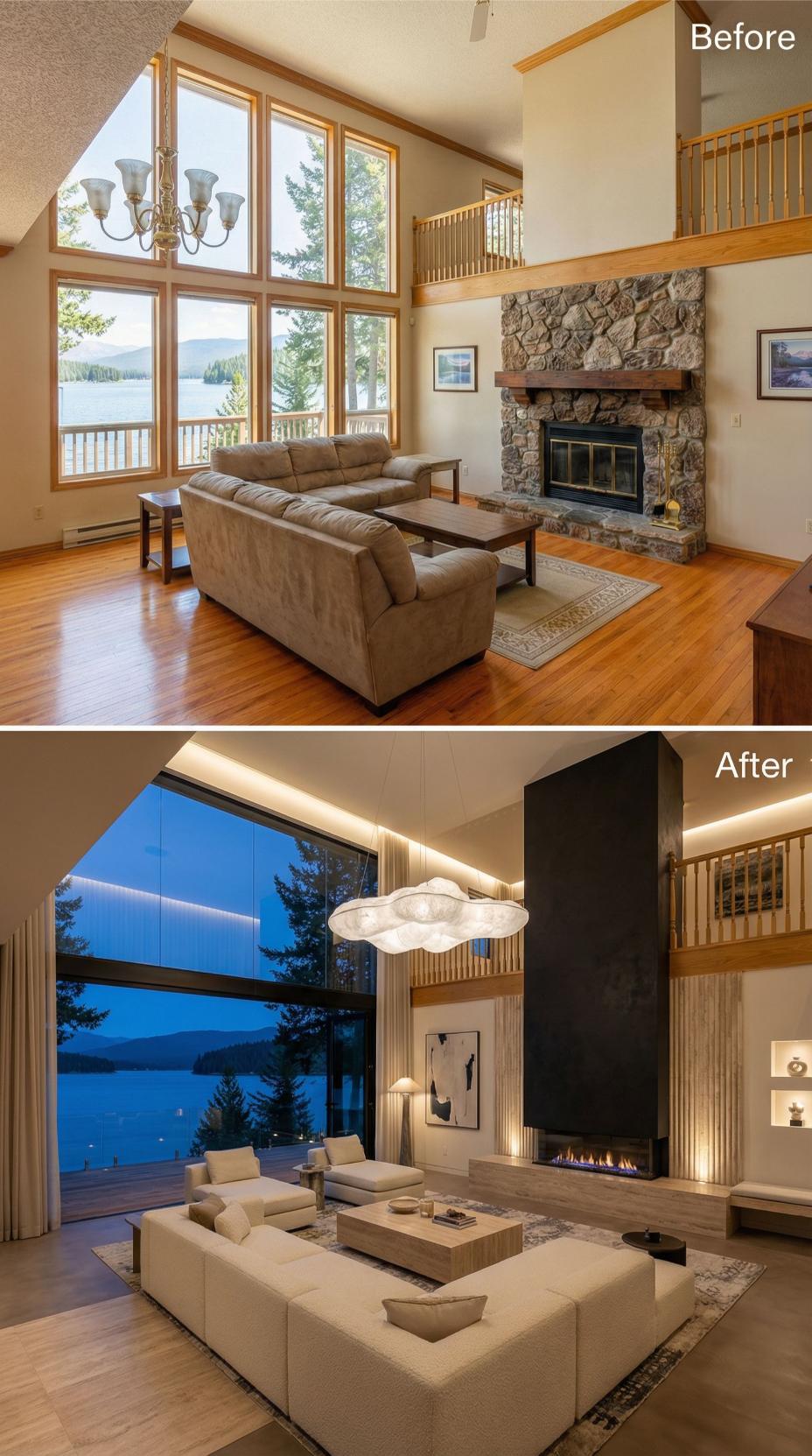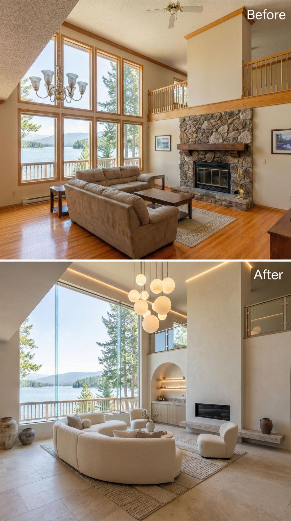 Warm wood finishes and traditional stone gave way to a sophisticated neutral palette featuring sleek linear elements. The original stone fireplace transformed into a streamlined modern hearth, while curved ivory seating replaced boxy brown furniture. Floor-to-ceiling windows now showcase unobstructed views, complemented by sculptural pendant lighting and natural textures that create an elevated lakeside retreat.