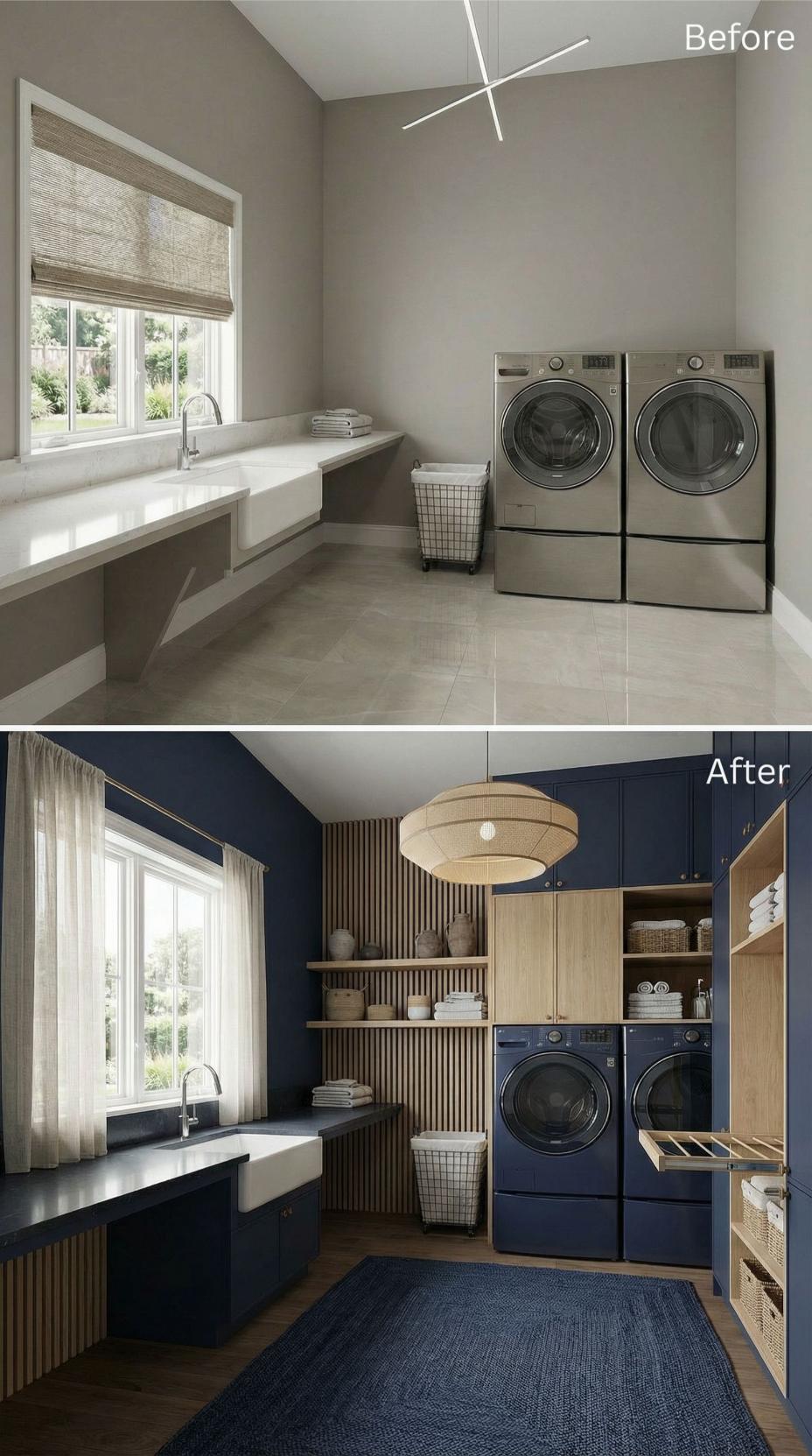 Bold navy cabinetry transforms this builder-grade laundry room into a sophisticated workspace with abundant personality. Vertical wood slat shelving adds textural warmth while providing organized display space for linens and supplies. The rich blue walls create dramatic contrast against natural wood accents, while built-in storage maximizes every inch of available space for a highly functional yet stylish result.