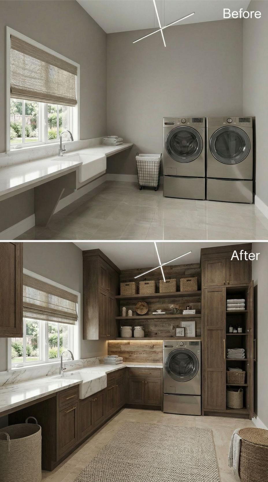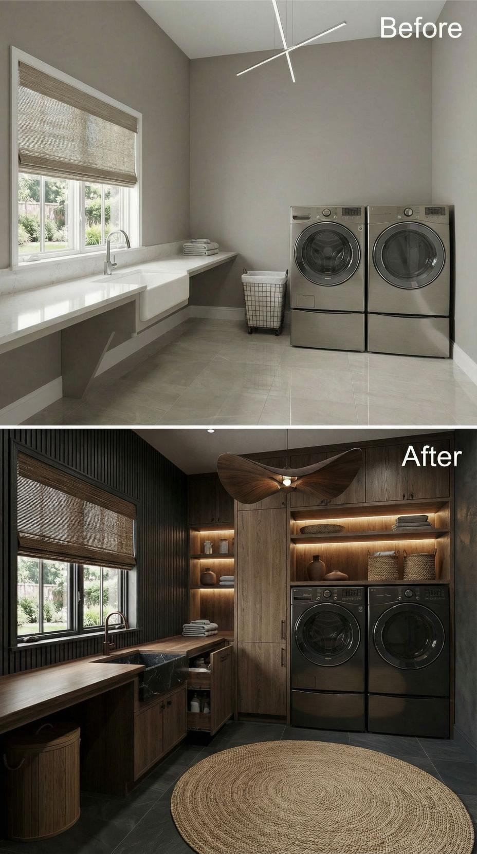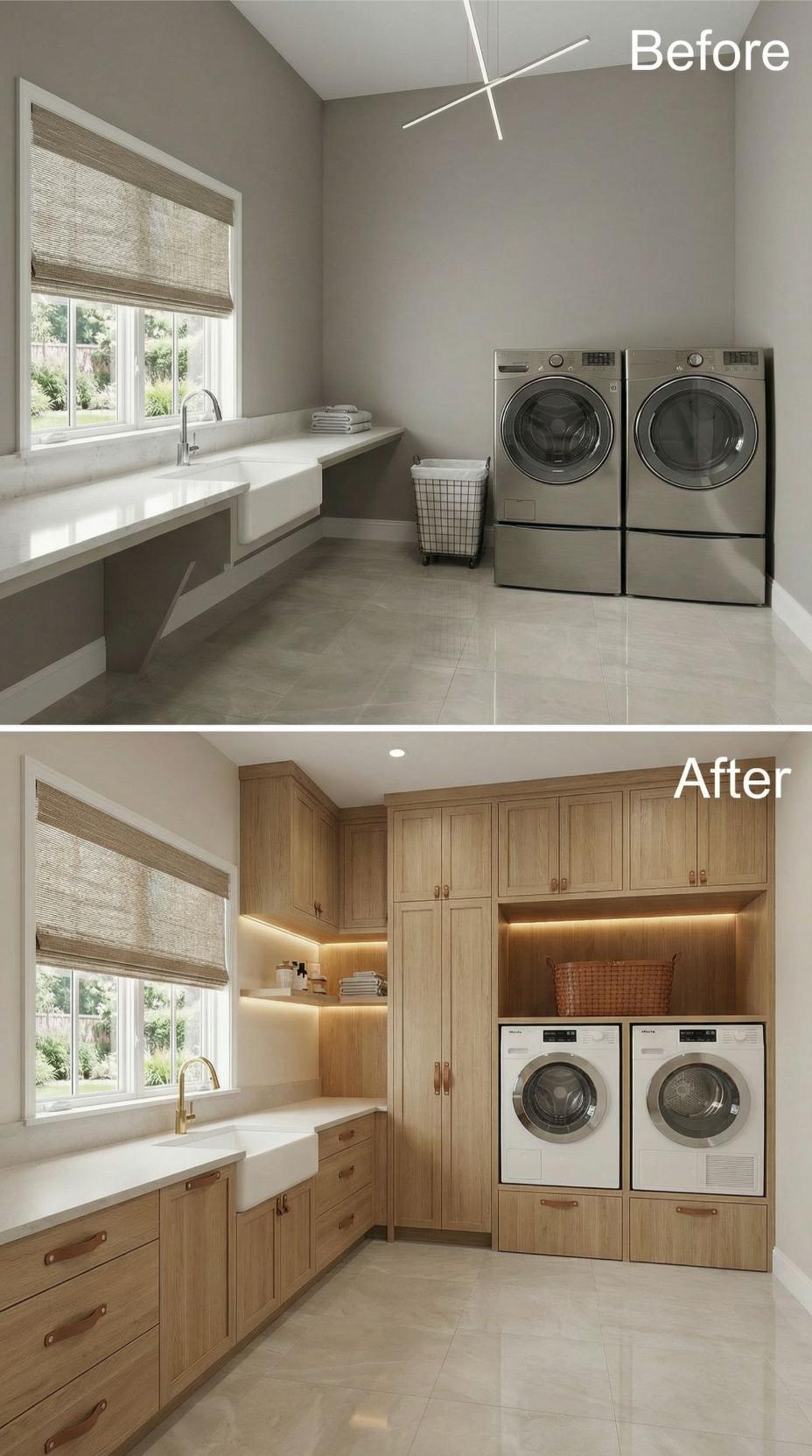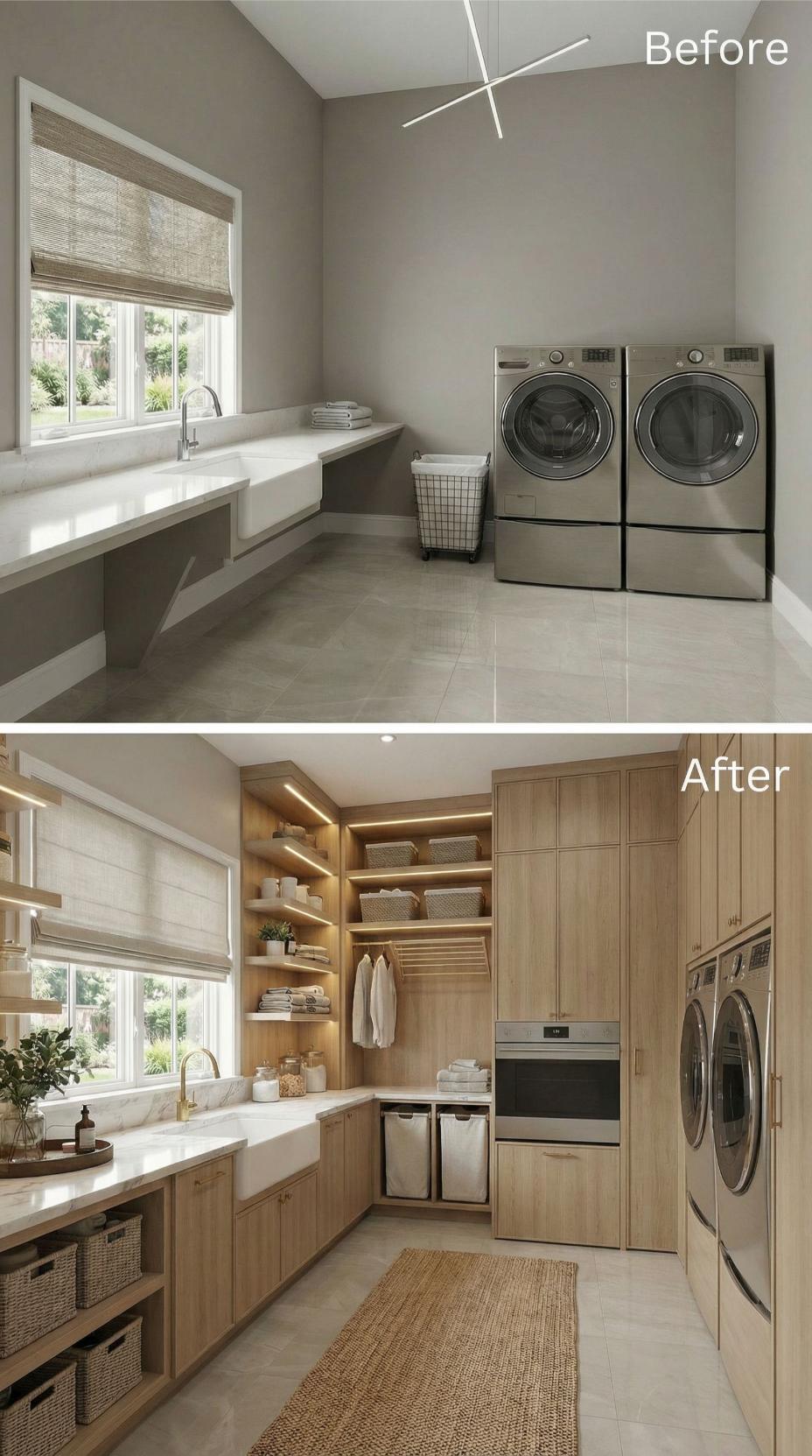 From Builder-Grade Basics to Warm Wood-Wrapped Luxury Laundry Haven
