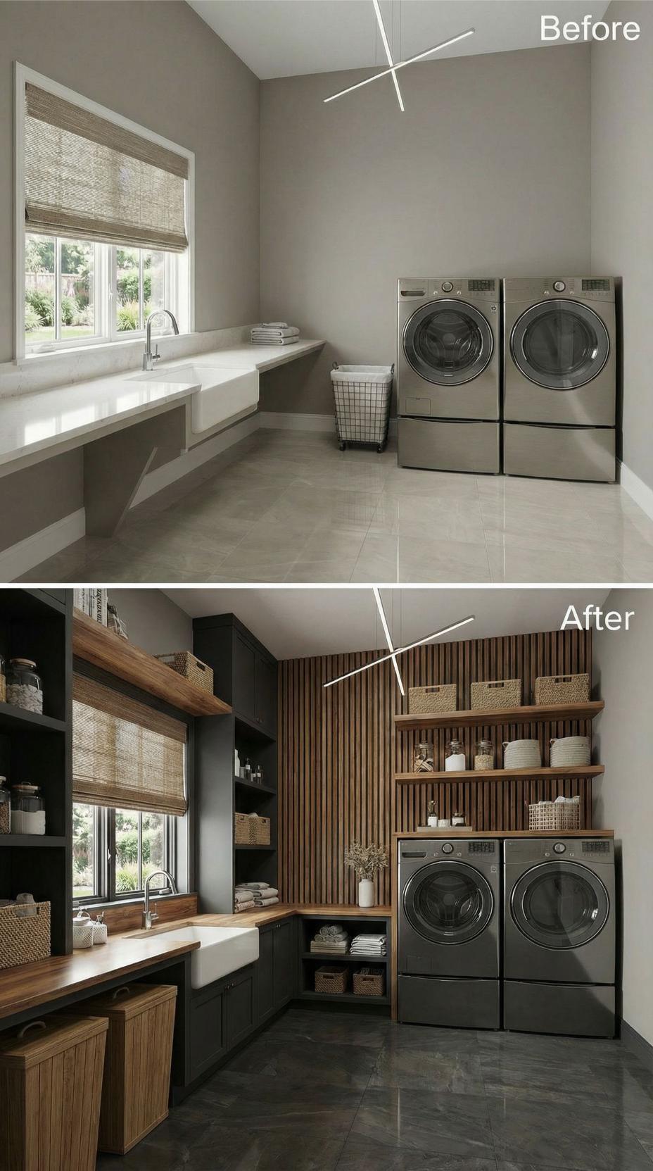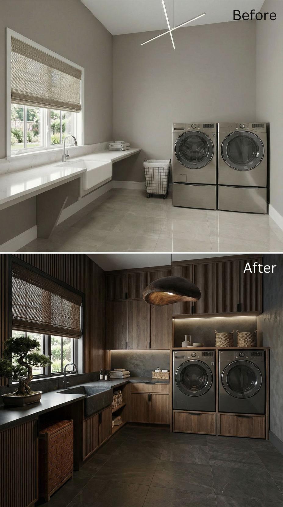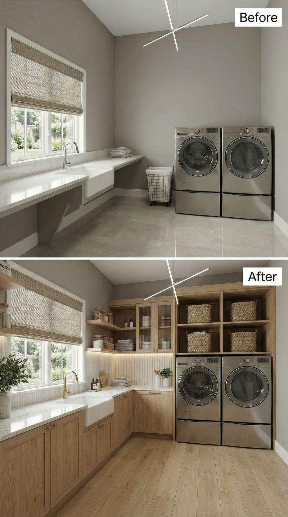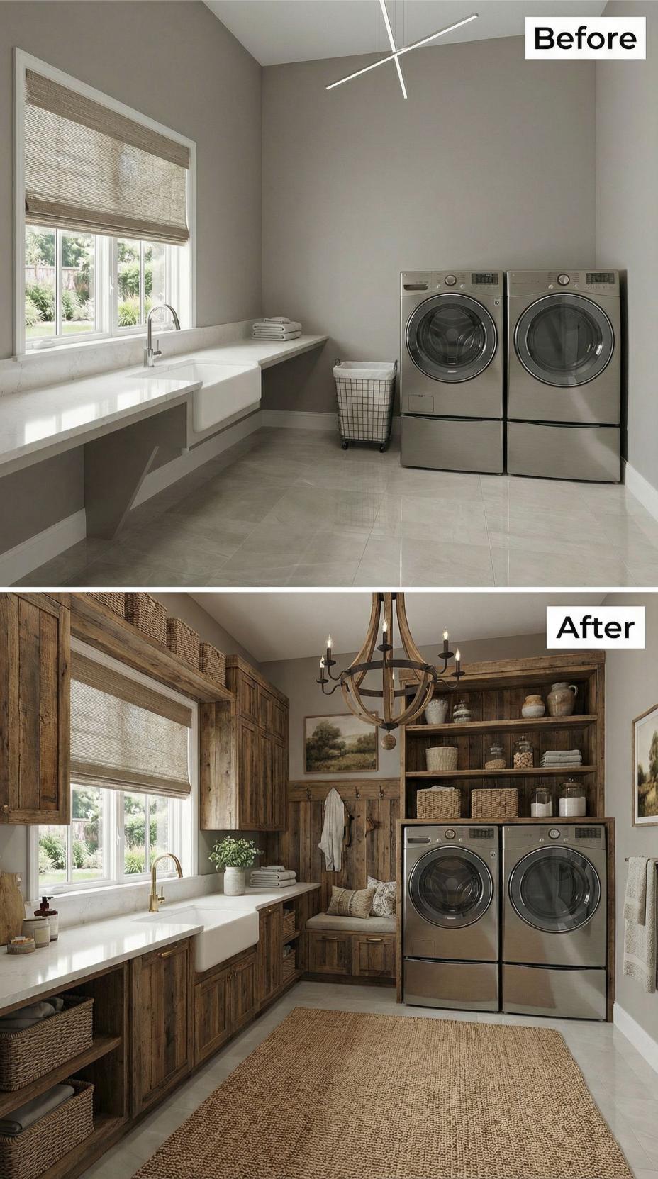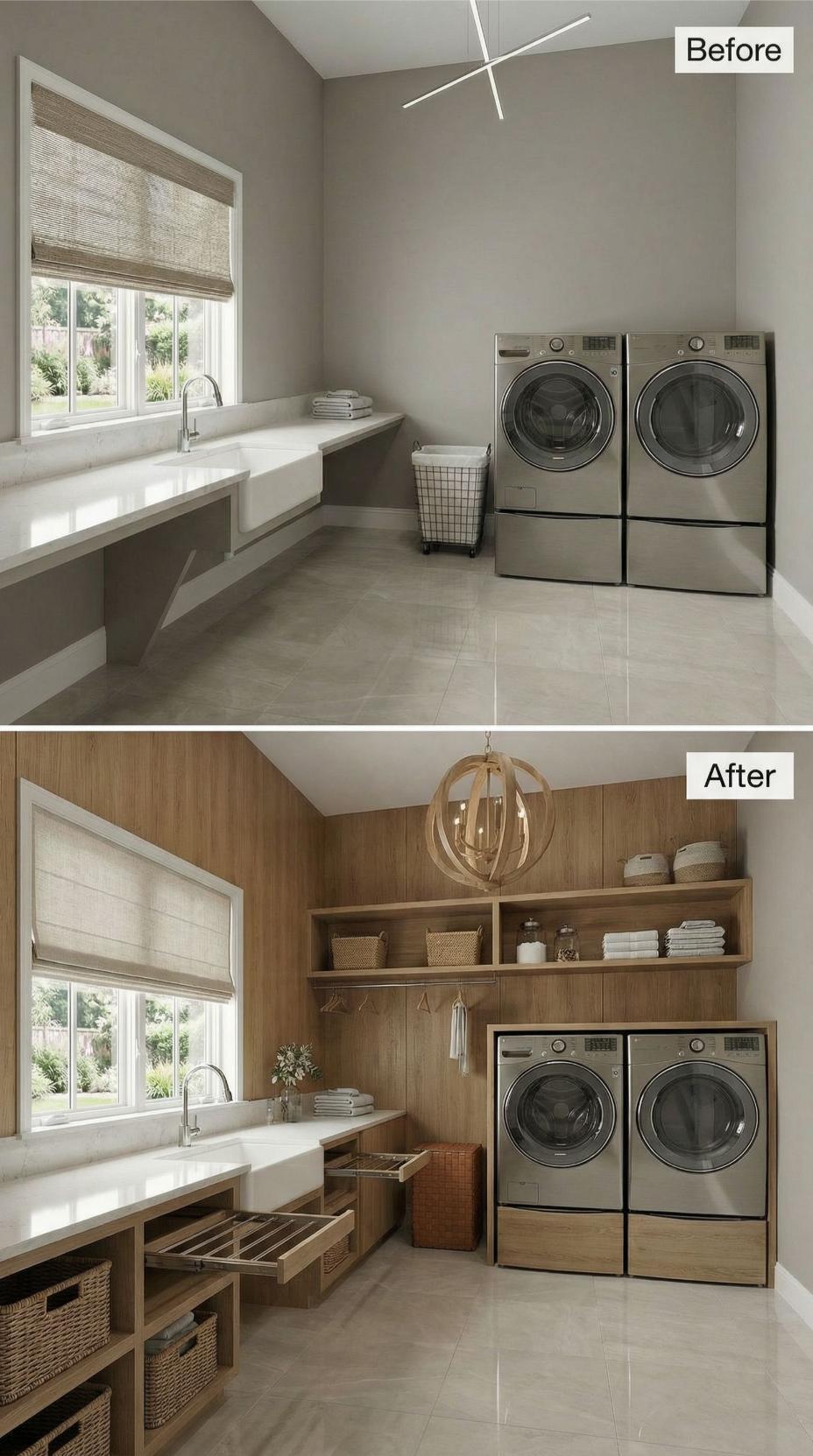 From Builder-Grade Basics to Warm Wood-Wrapped Luxury Laundry Haven