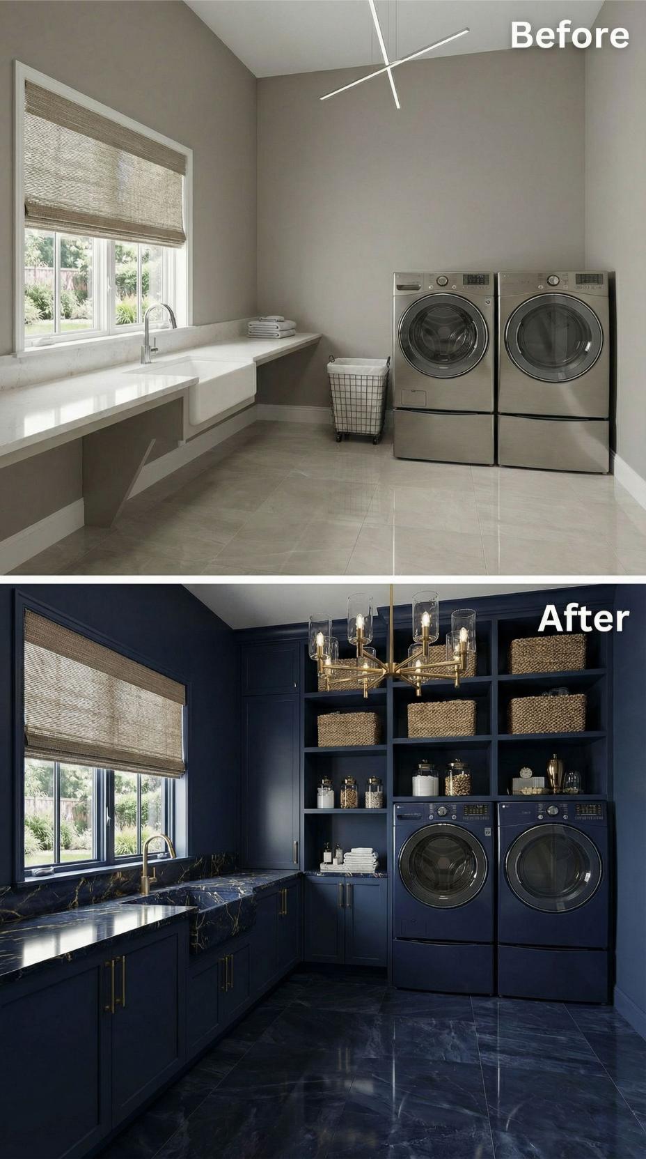 Navy blue custom cabinetry transforms this builder-grade laundry room into a sophisticated workspace with integrated storage solutions. Built-in shelving accommodates woven baskets and glass containers while black marble countertops with dramatic veining replace the original white surfaces. Brass hardware and a statement chandelier elevate the space from purely functional to luxuriously appointed, proving laundry rooms deserve the same design attention as main living areas.