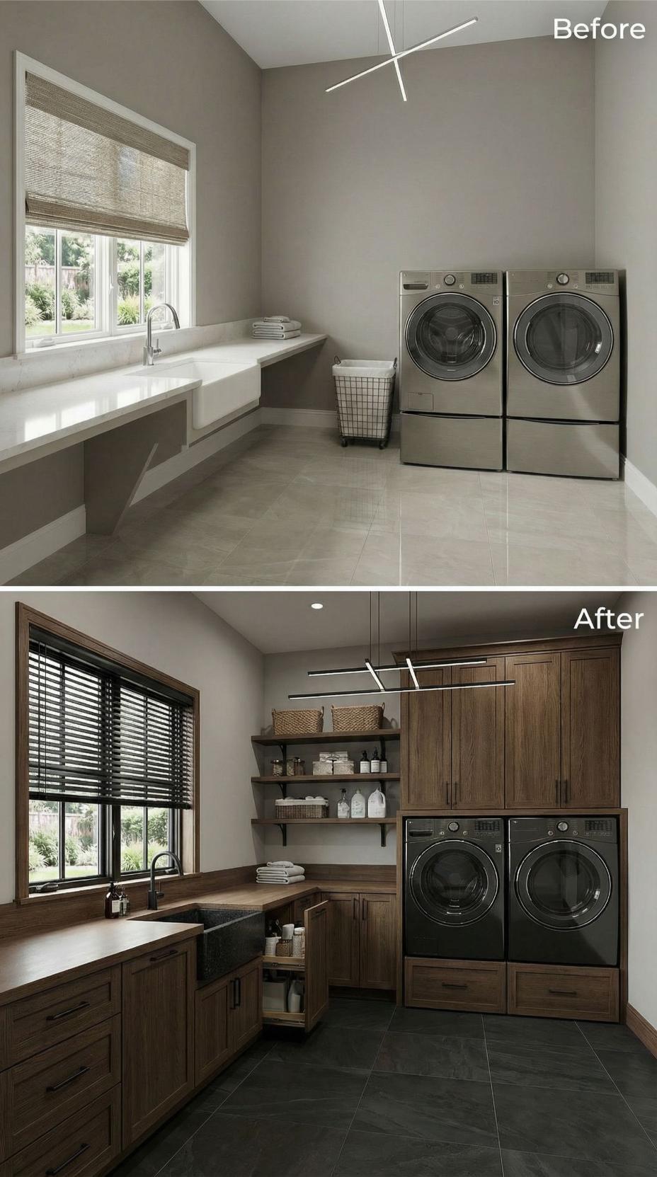 Rich walnut cabinetry transforms this builder-grade laundry room into a sophisticated workspace with integrated appliance housing and extensive storage solutions. Dark wood blinds replace basic window treatments while floating shelves maximize vertical space for baskets and supplies. The warm wood tones create a cohesive design that elevates everyday laundry tasks into a more pleasant experience.