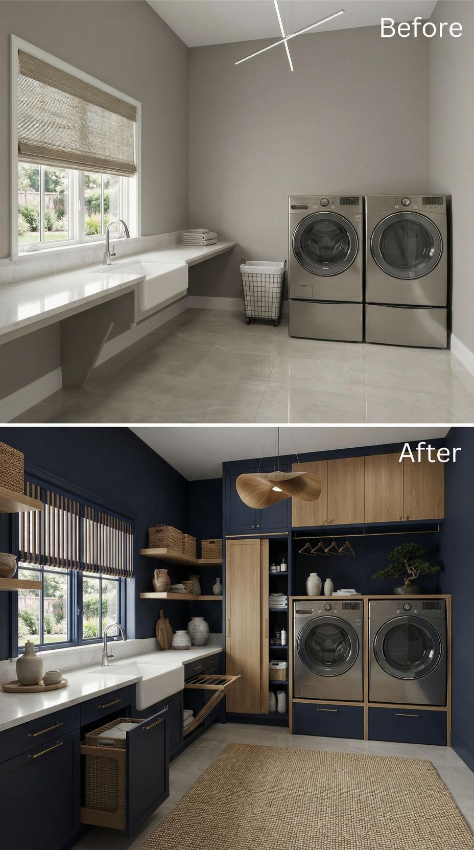 Bold navy cabinetry transforms this builder-grade laundry room into a sophisticated workspace with extensive storage solutions. Natural wood accents warm the dramatic color palette, while open shelving displays ceramic vessels and woven baskets for both function and style. The renovated space maximizes vertical storage with floor-to-ceiling cabinets, pull-out drawers, and dedicated hanging areas for optimal organization.