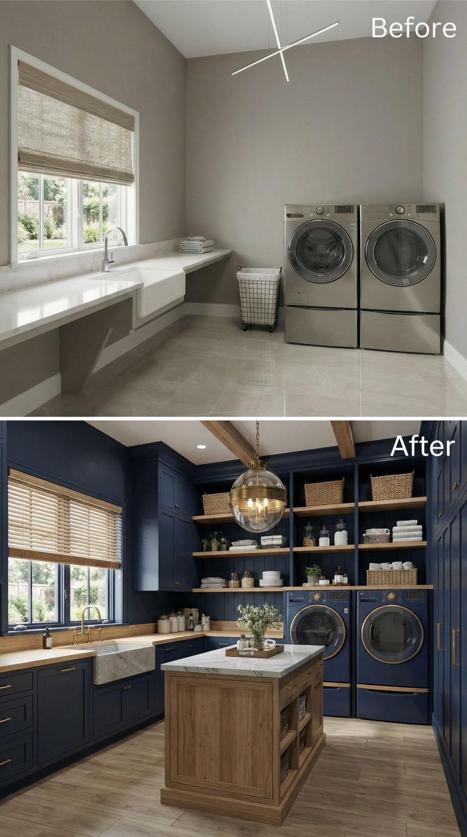 Rich navy cabinetry transforms this builder-grade laundry room into a sophisticated workspace with brass hardware and abundant storage. Wood countertops warm the bold color palette while open shelving displays essentials in style. The central island adds prep space and houses the farmhouse sink, creating a true utility room that rivals any kitchen design.