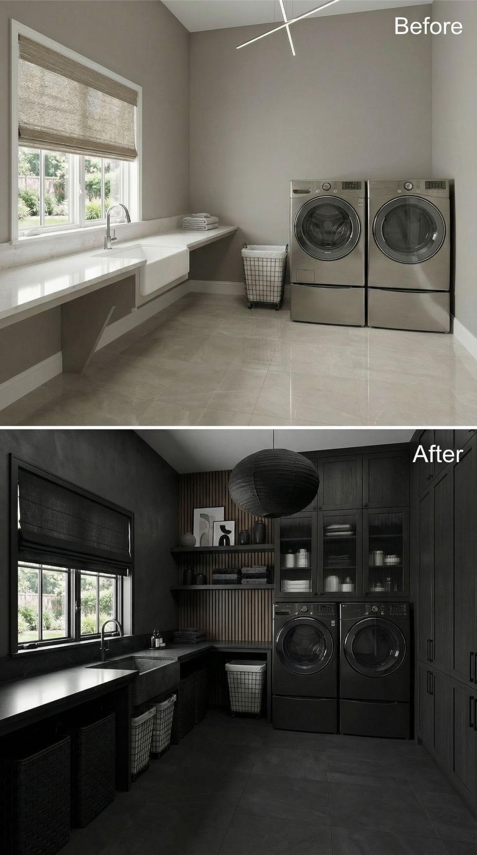 Dramatic charcoal cabinetry transforms this builder-grade laundry room into a sophisticated workspace with floor-to-ceiling storage solutions. Custom ribbed wood panels create textural interest while built-in shelving maximizes vertical space. Black countertops and matching appliances maintain the monochromatic palette, while strategic lighting highlights the room’s newfound architectural depth and functionality.