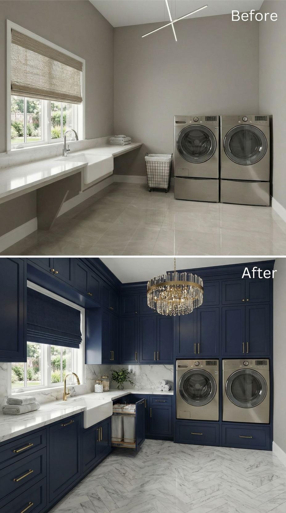Bold navy blue shaker-style cabinetry with brass hardware elevates this builder-grade laundry room into a sophisticated workspace. Custom built-ins maximize storage around the existing washer and dryer, while marble countertops and backsplash add luxury. The dramatic crystal chandelier creates an unexpected glamorous focal point, proving laundry rooms deserve the same design attention as any other space in the home.