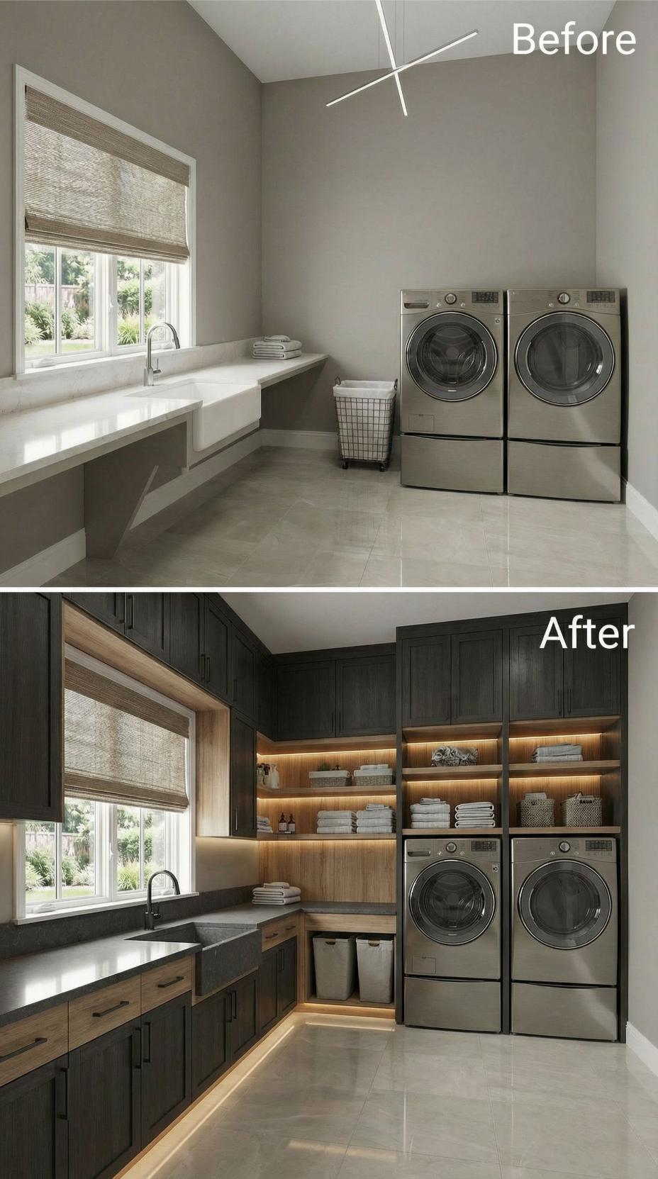Dark forest green cabinetry transforms a bland builder-grade laundry room into a sophisticated workspace with abundant storage. Warm LED strip lighting illuminates open shelving, while rich wood accents soften the dramatic color palette. The redesign maximizes every inch with custom built-ins, pullout hampers, and organized zones that make laundry tasks feel luxurious rather than mundane.