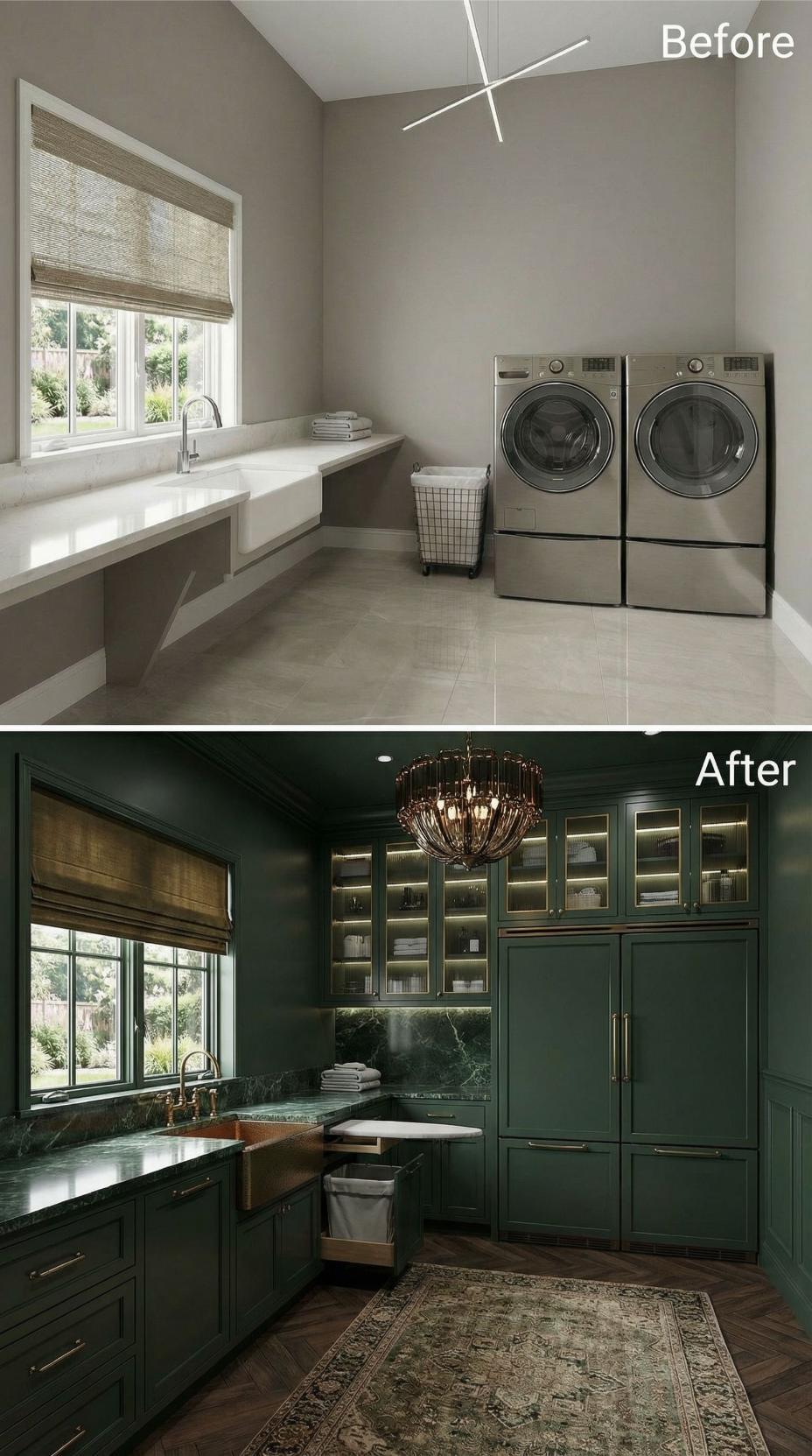 Dark forest green cabinetry transforms this builder-grade laundry room into a sophisticated workspace that rivals any high-end kitchen. Floor-to-ceiling storage maximizes every inch while maintaining the same window and appliance placement. The dramatic crystal chandelier elevates the mundane task of laundry into something luxurious. Rich materials and thoughtful lighting create an entirely new experience in the same footprint.