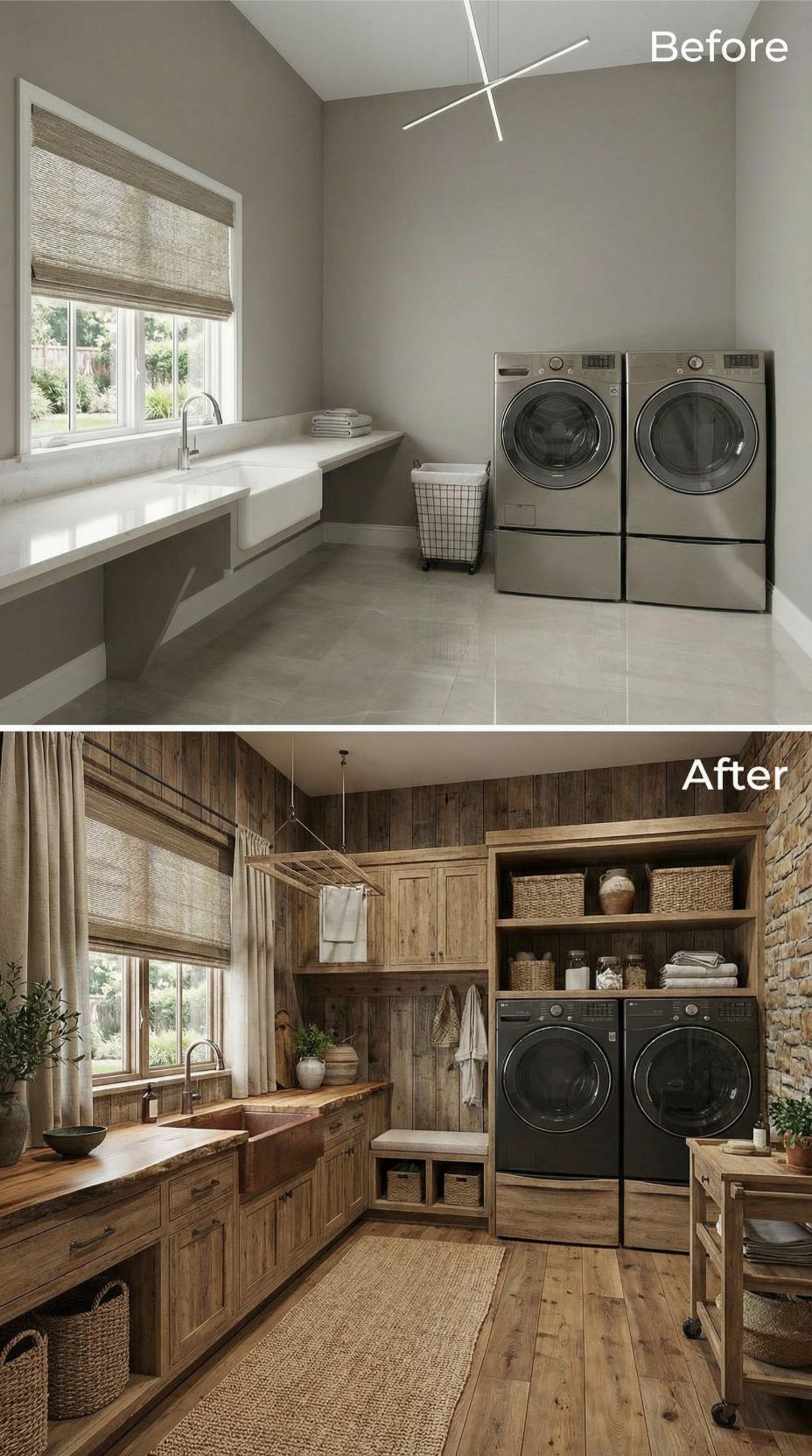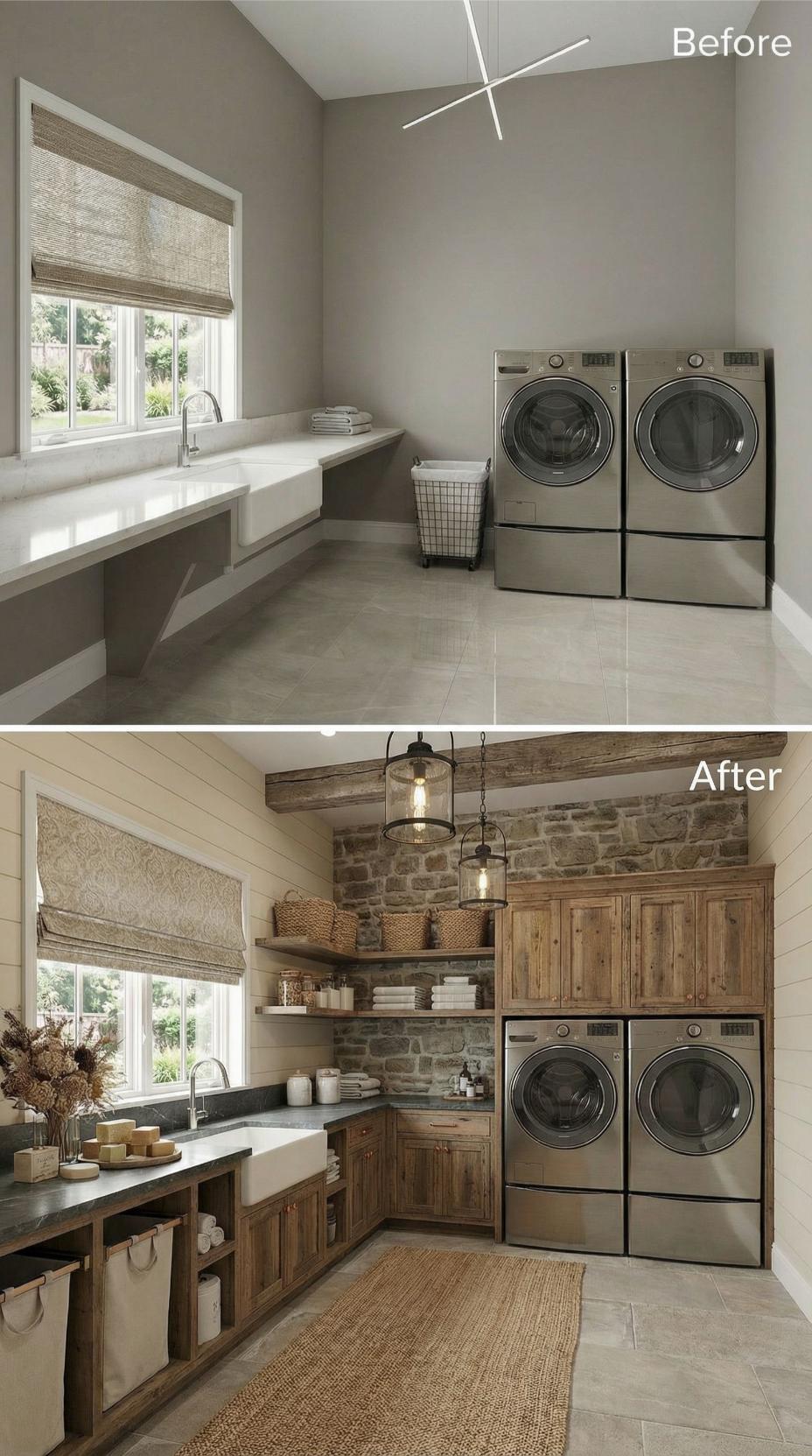 A builder-grade laundry room transforms dramatically through natural stone accent walls and weathered wood cabinetry. Industrial pendant lighting replaces stark overhead fixtures while floating shelves maximize vertical storage. Rich textures from woven baskets and natural fiber rugs soften the space, creating an inviting workspace that feels more like a cozy kitchen than a utilitarian laundry area.