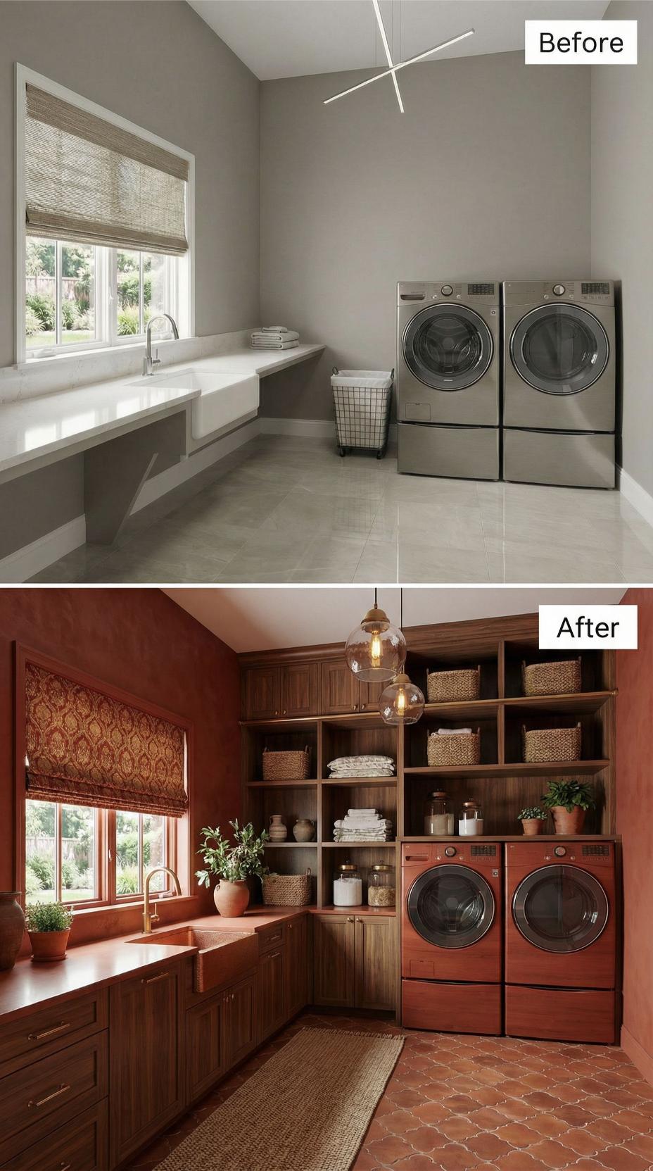Terracotta walls replace bland gray surfaces, creating an inviting backdrop for this complete laundry room transformation. Rich wood cabinetry with traditional panel doors adds substantial storage while maintaining the room’s newfound warmth. Patterned cement tiles in earthy tones anchor the space, complemented by woven baskets and a statement macramé chandelier that elevates the builder-grade laundry room into a functional yet stylish retreat.