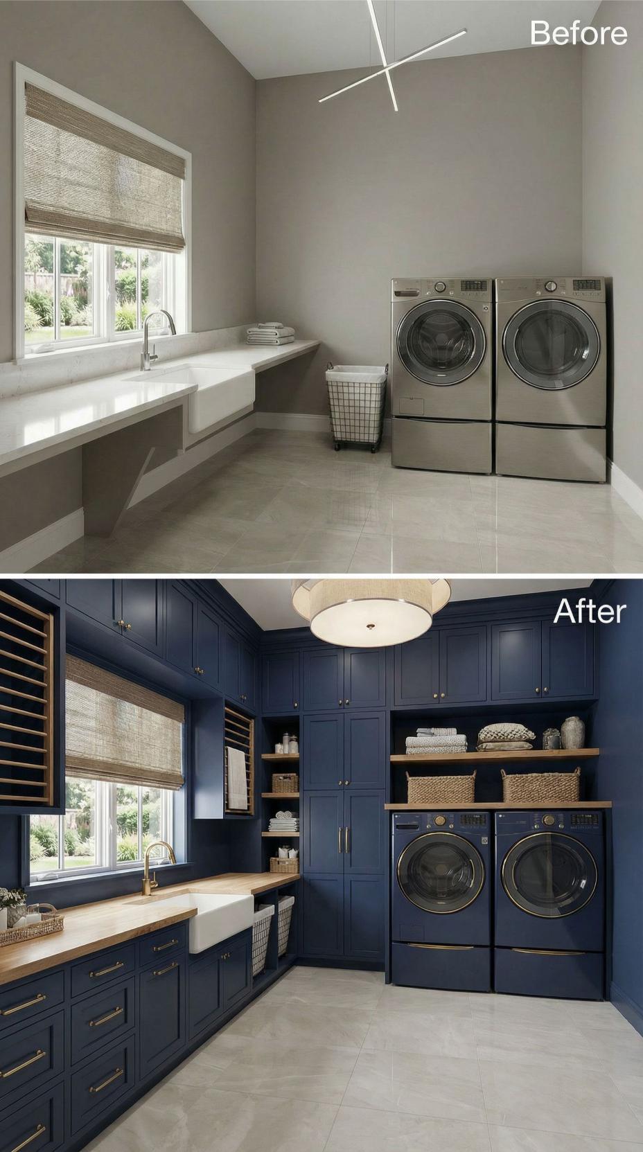 Bold navy cabinetry transforms this builder-grade laundry room into a sophisticated workspace with abundant storage solutions. Custom cabinets extend floor-to-ceiling, creating designated zones for the washer and dryer while maximizing vertical space. Brass hardware adds warmth against the rich blue finish, while open shelving with woven baskets maintains organized accessibility. The butcher block countertop introduces natural texture, perfectly complementing the farmhouse sink and creating an elevated laundry experience.