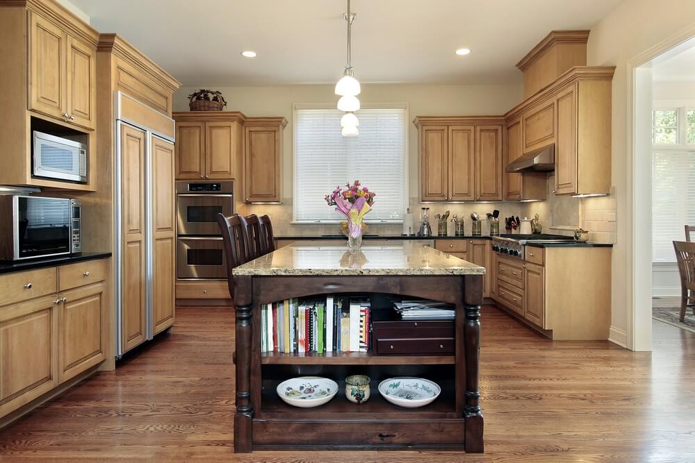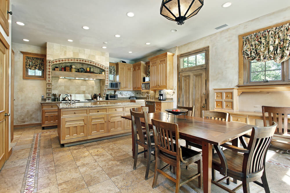 Here we have an example of open kitchen design with light wood keeping up in brightness with the large open window.This old fashioned tile floor kitchen’s wide open design is complimented by light wood cabinetry and marble topped island.