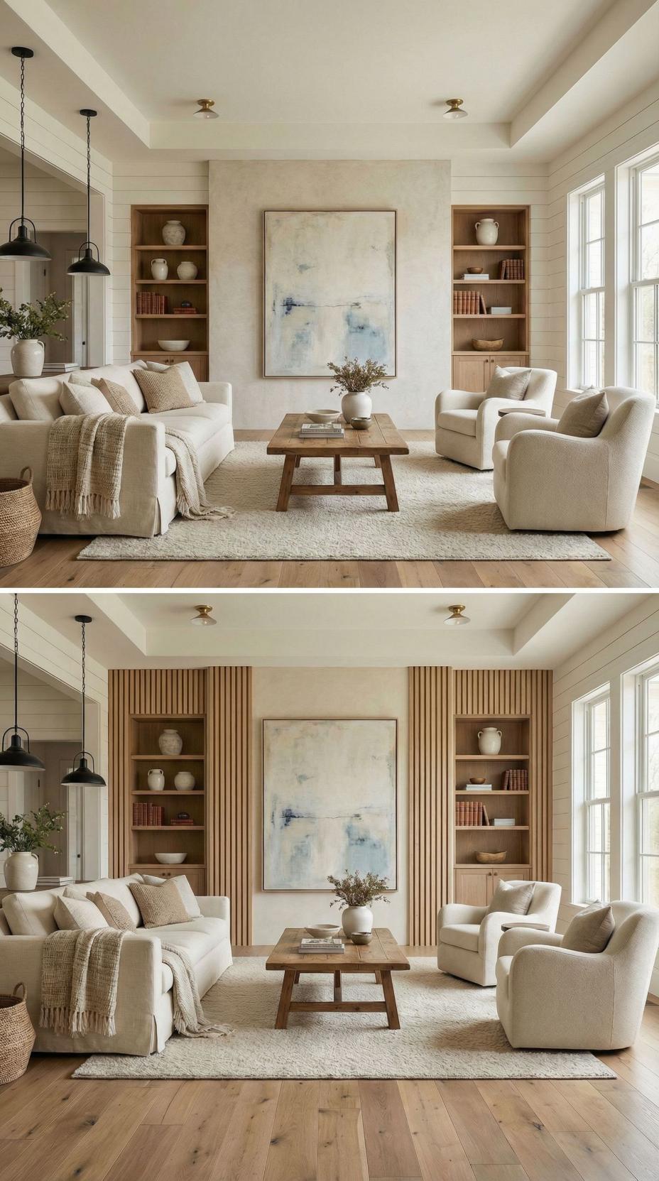 Vertical wood slats transform a bland accent wall into a sophisticated focal point that perfectly frames the built-in shelving. The warm wood tone adds texture and visual interest while maintaining the room’s neutral palette. Black pendant lights and cream upholstery create beautiful contrast against the natural wood grain, elevating the entire living space from ordinary to extraordinary.