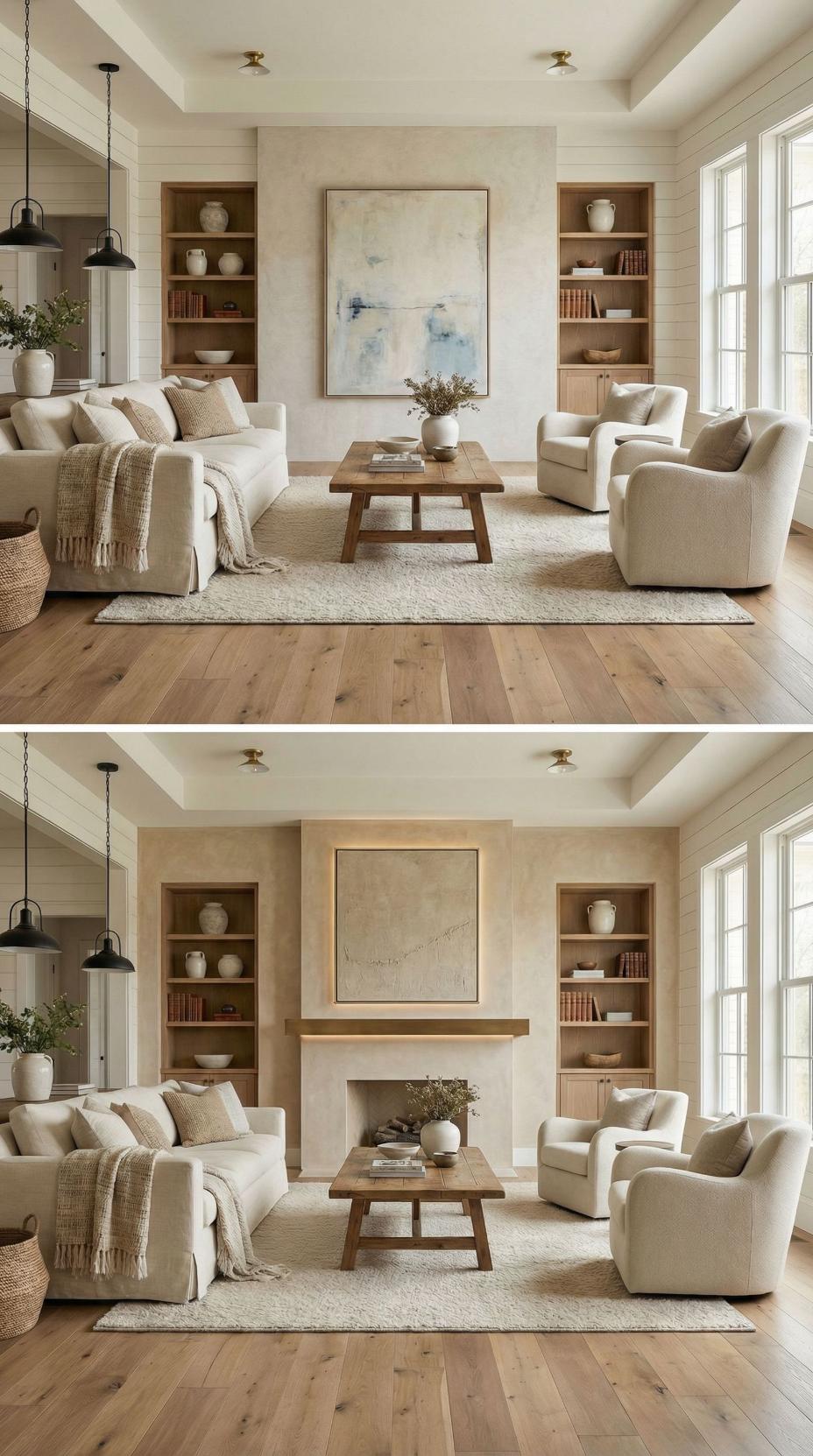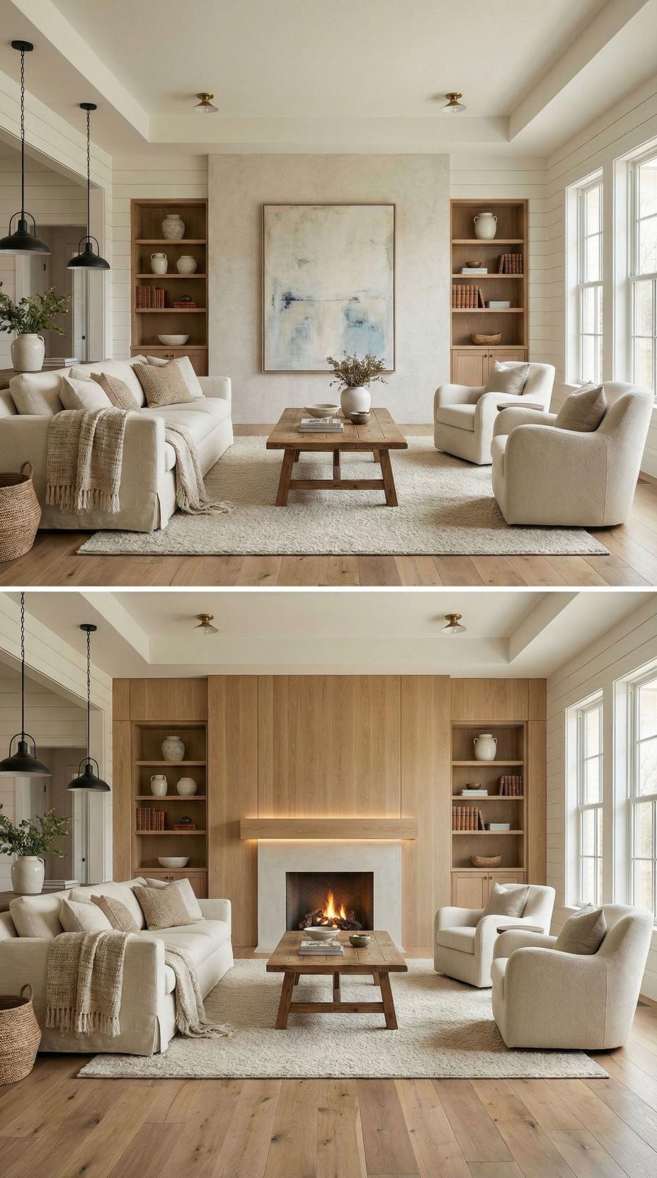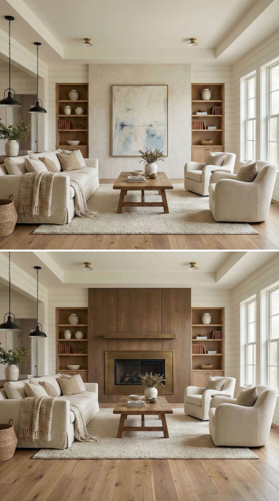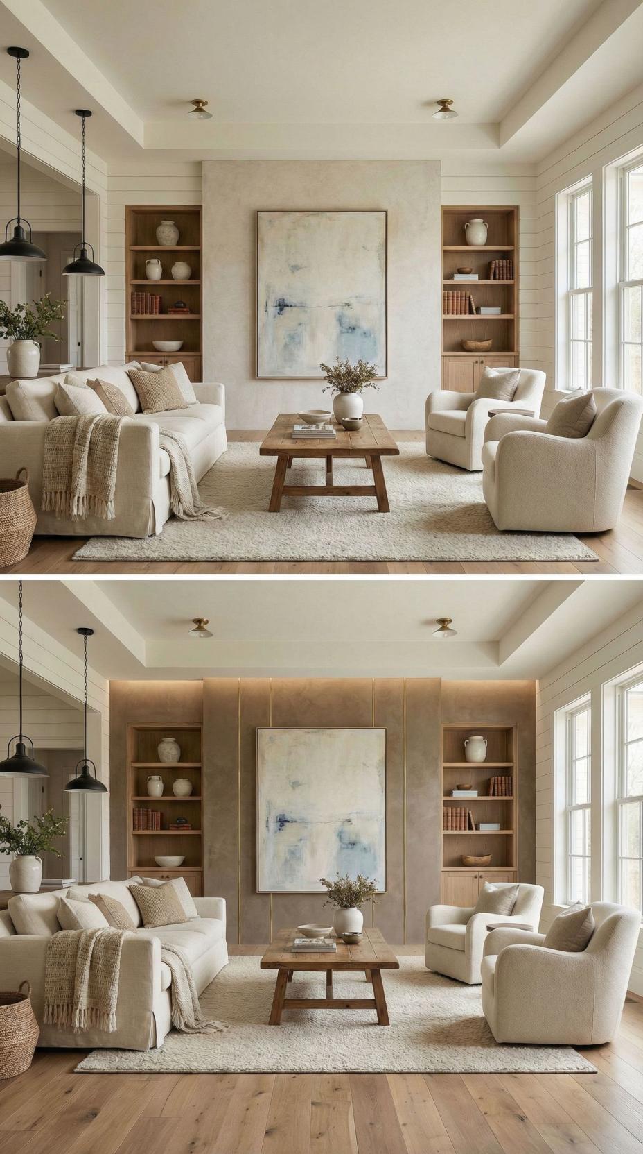 Natural wood planking creates a stunning focal point where a plain living room accent wall once stood. The horizontal grain patterns add warmth and texture, while built-in shelving maintains the clean aesthetic. Brass ceiling fixtures complement the rich wood tones, and cream upholstery keeps the palette cohesive. This transformation demonstrates how architectural elements can completely reimagine a space’s character.