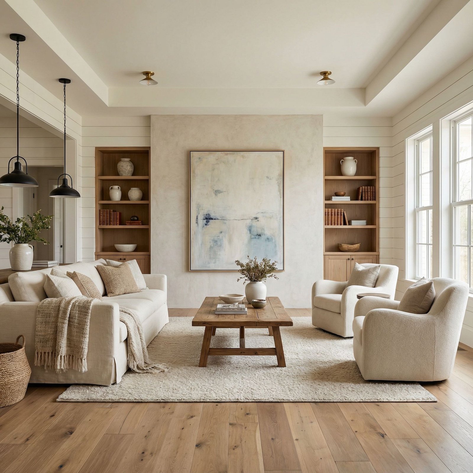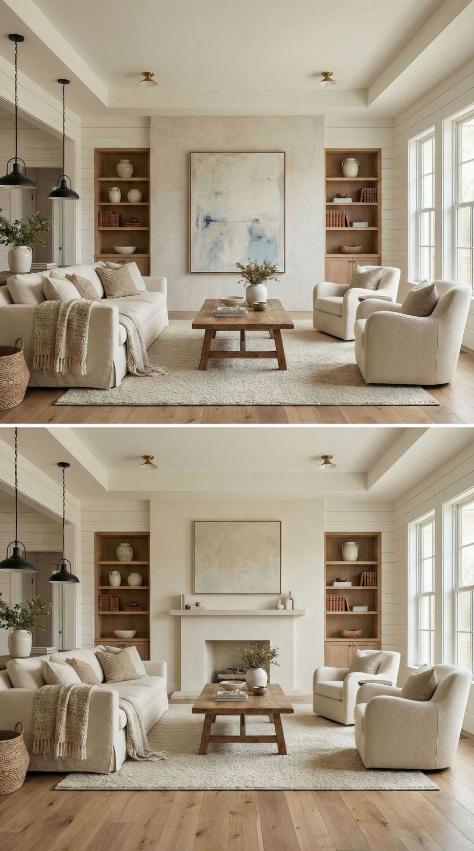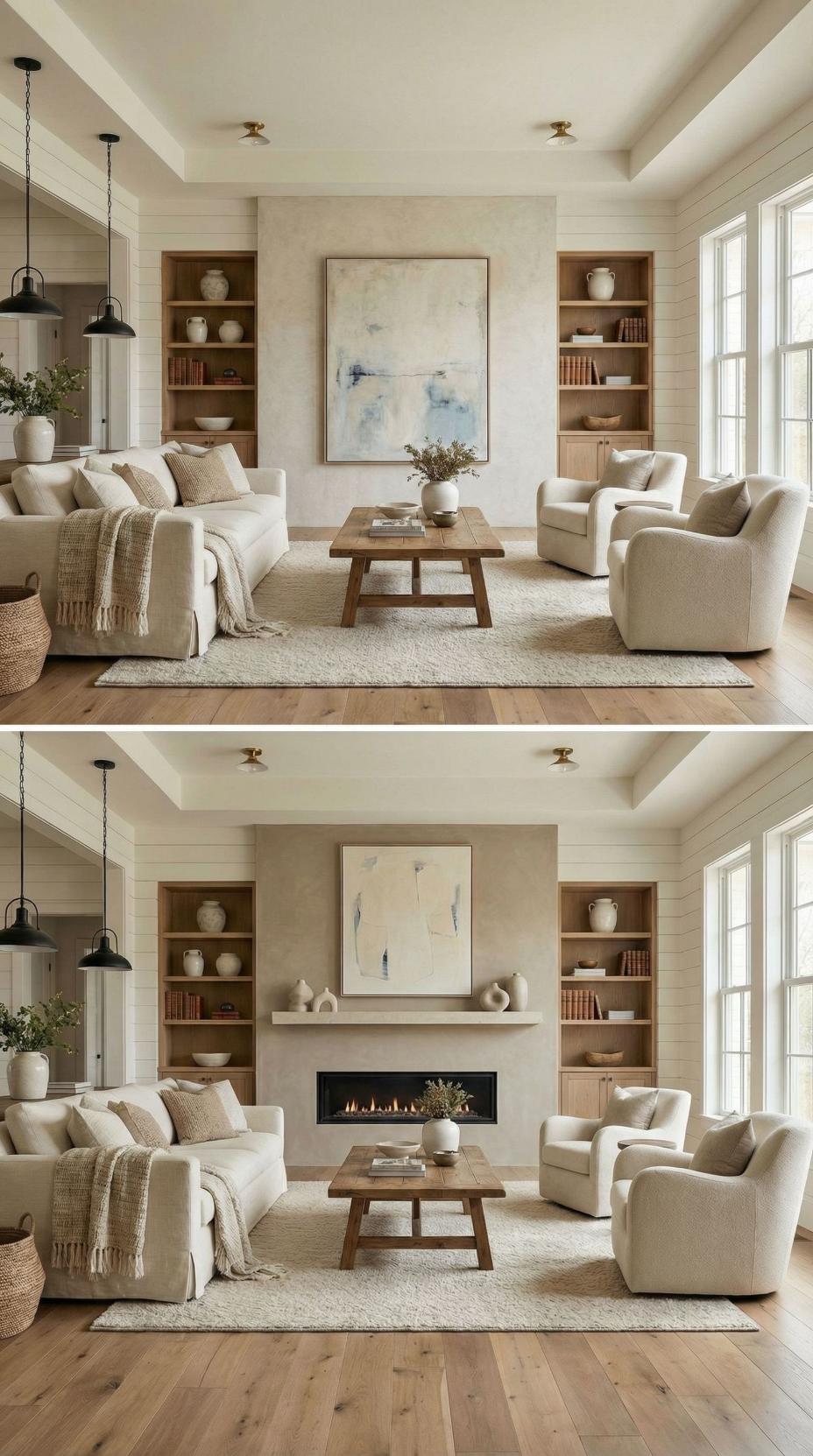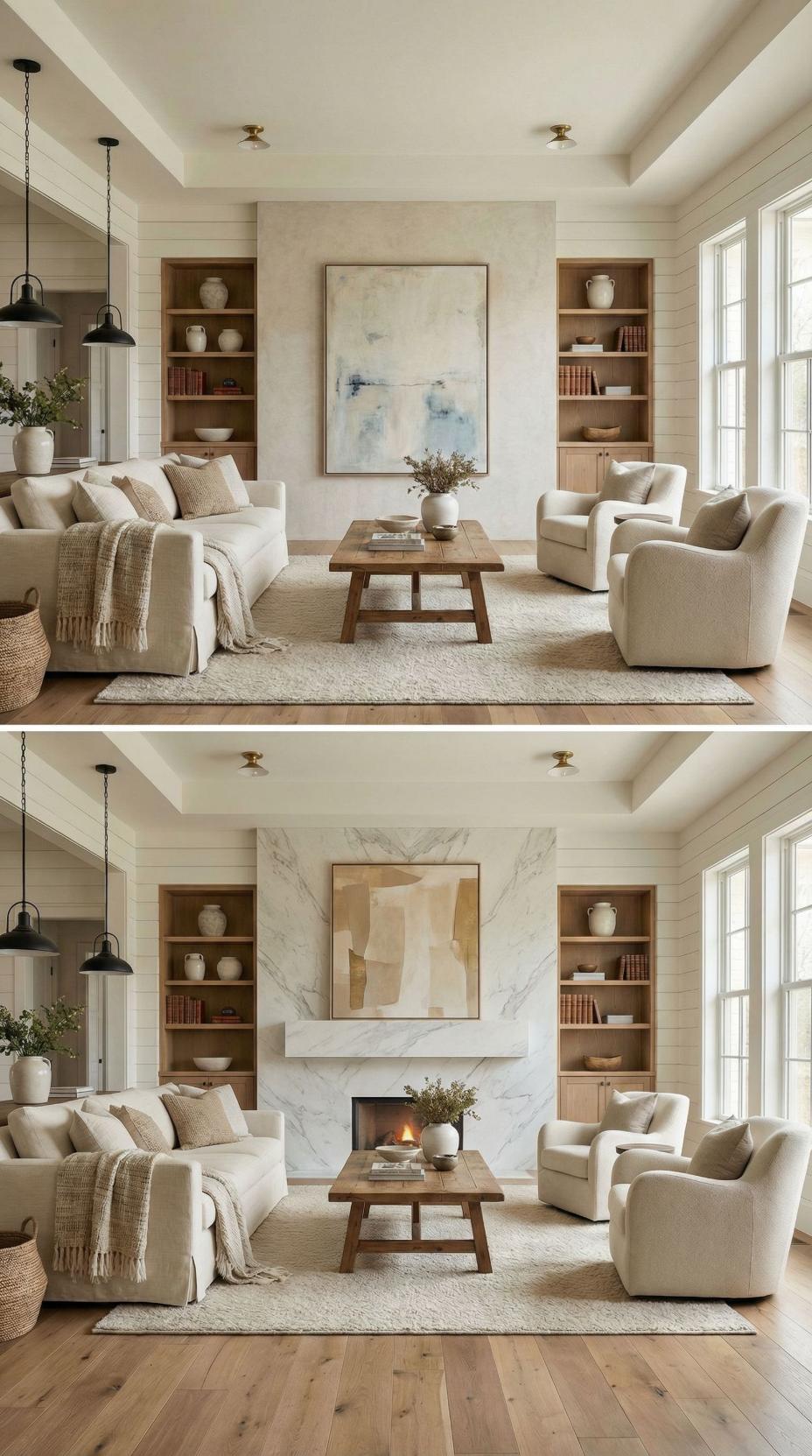 Natural wood planking creates a stunning focal point where a plain living room accent wall once stood. The horizontal grain patterns add warmth and texture, while built-in shelving maintains the clean aesthetic. Brass ceiling fixtures complement the rich wood tones, and cream upholstery keeps the palette cohesive. This transformation demonstrates how architectural elements can completely reimagine a space’s character.