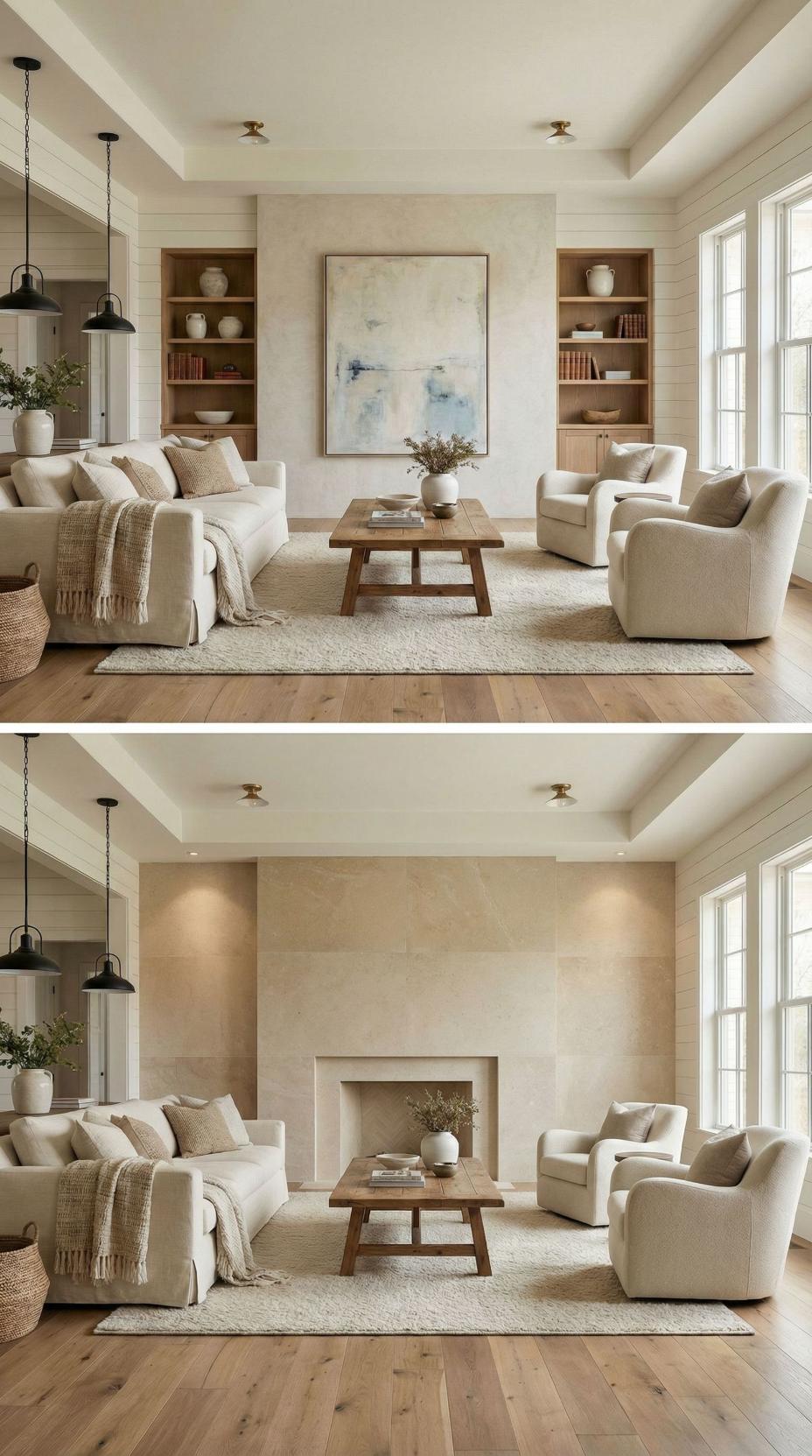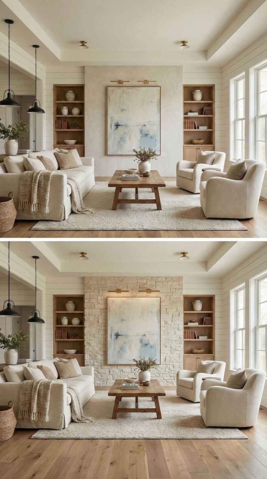 Natural limestone transforms this plain living room accent wall into an architectural masterpiece complete with a clean-lined fireplace and symmetrical built-in shelving. Warm wood tones in the recessed bookcases create visual depth while maintaining the neutral palette. The fireplace becomes a stunning focal point that anchors the seating arrangement and elevates the entire space from basic to breathtaking.