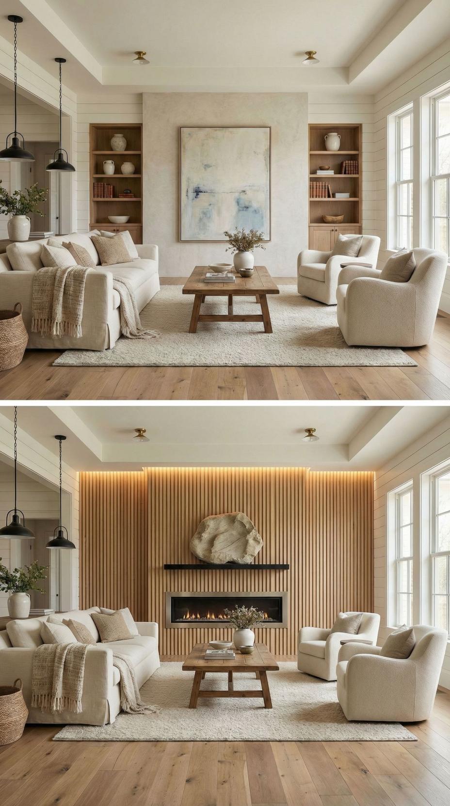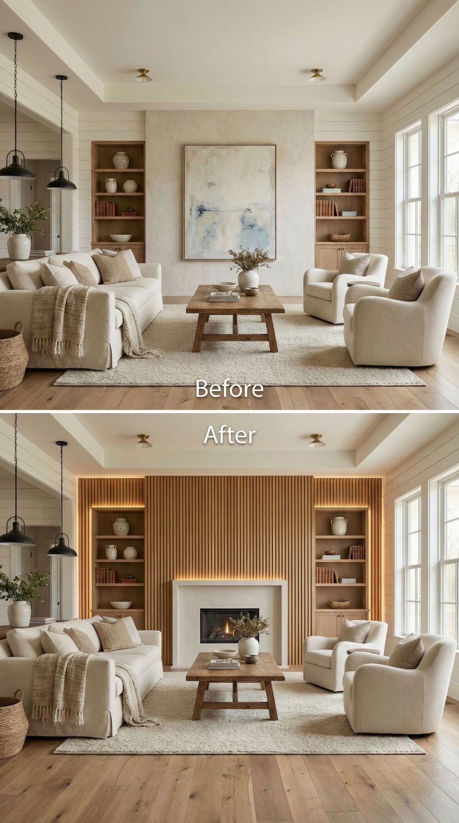 From Plain Living Room Accent Wall to Wood Slat Fireplace Feature
