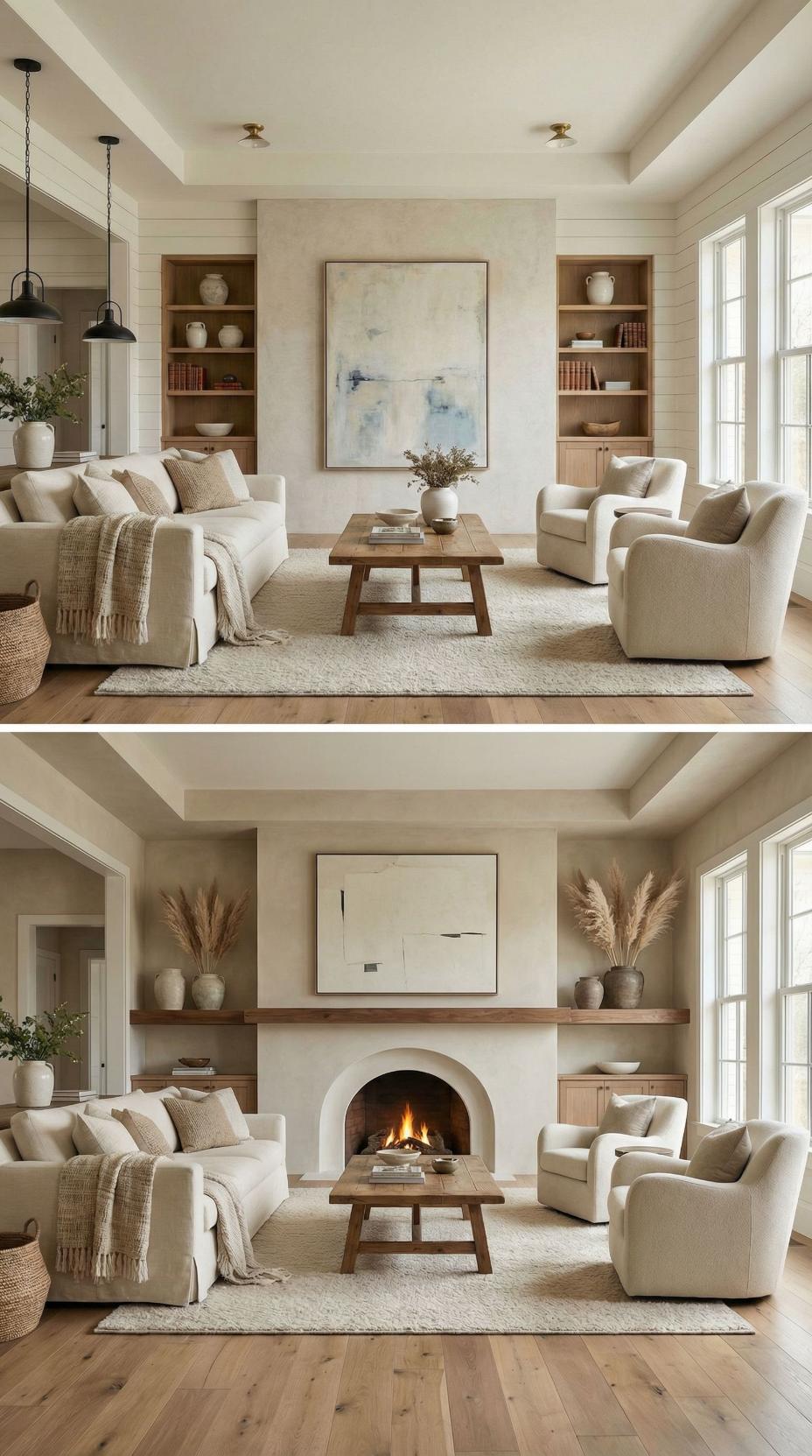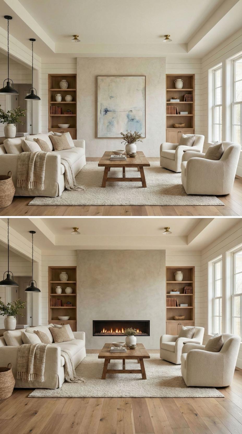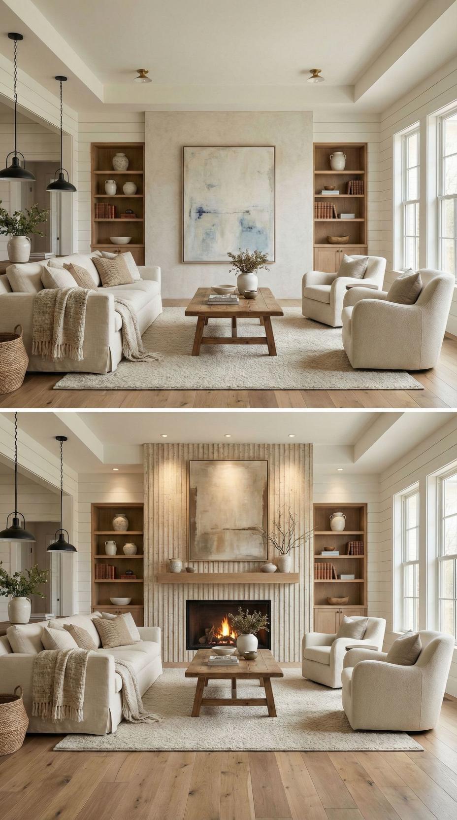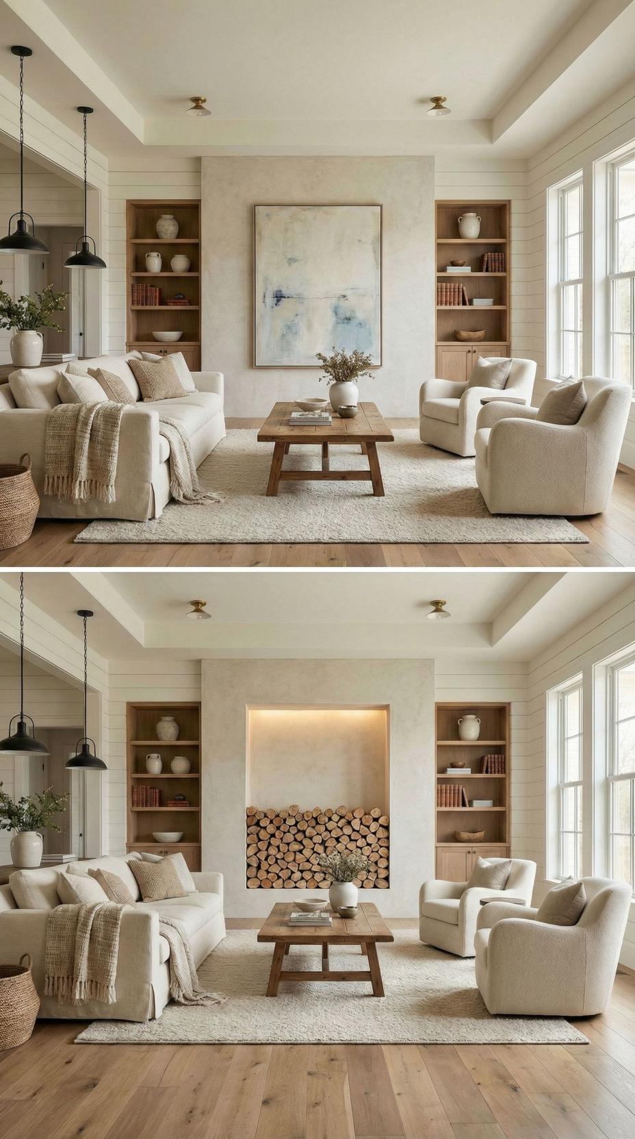 Wood-Clad Fireplace Feature Wall Transforms Neutral Living Space