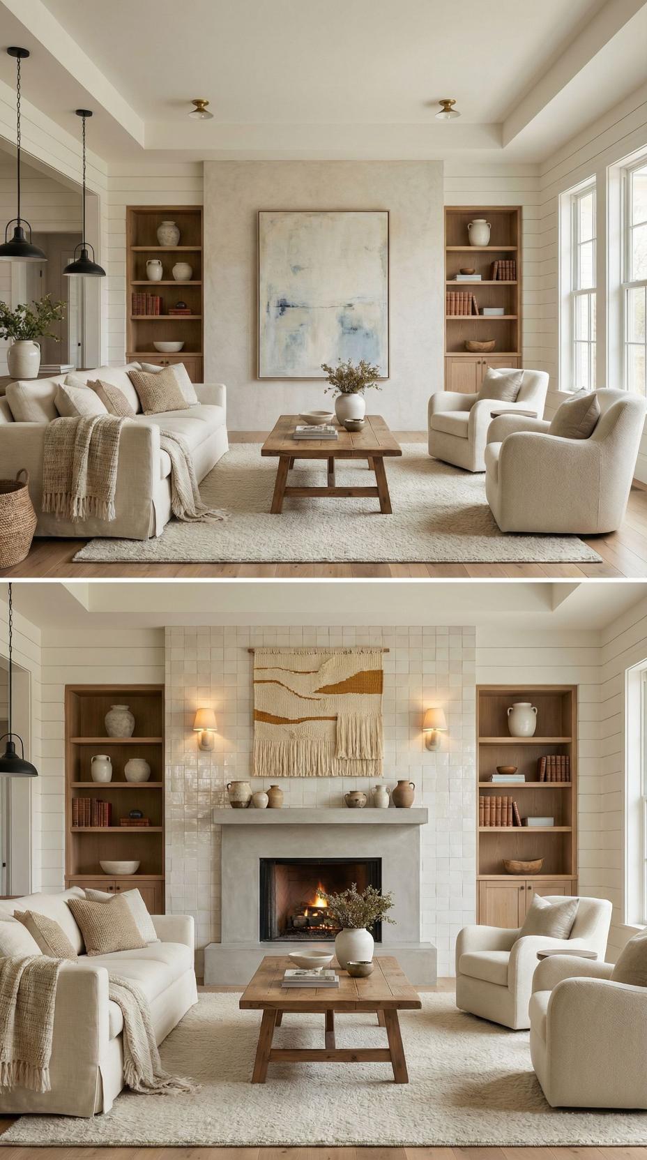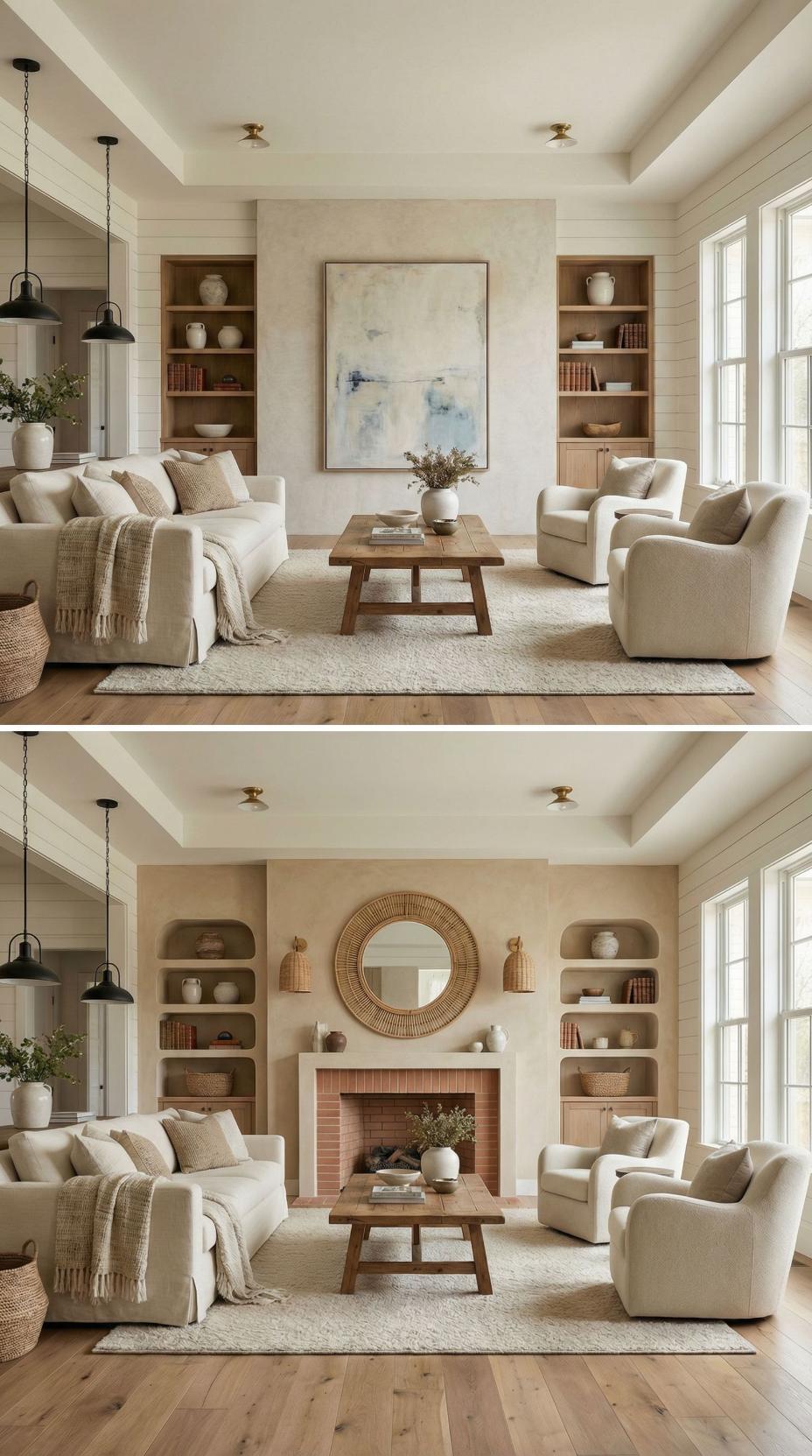 Built-in shelving flanking a newly added brick fireplace replaces the plain living room accent wall with rich architectural depth. Warm wood shelves display curated pottery and books while wicker pendant lights add textural interest above the mantel. The transformation creates a cozy gathering spot anchored by natural materials and thoughtful styling that elevates the entire neutral living space.