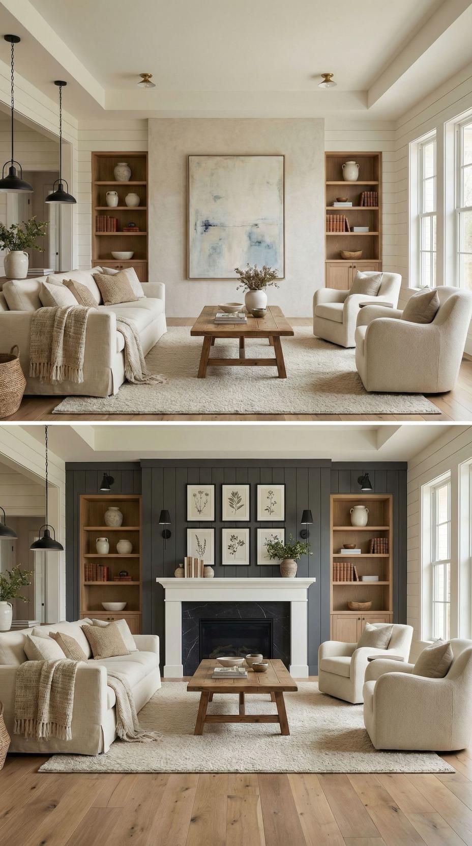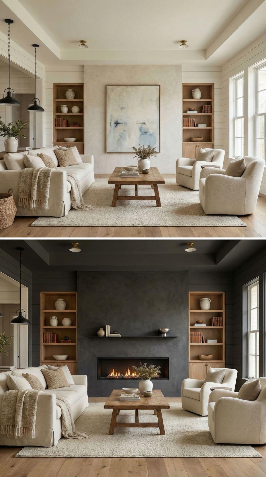 Neutral beige walls transform into a sophisticated charcoal accent wall featuring a sleek linear fireplace and floating mantel shelf. Built-in natural wood shelving flanks both sides, creating perfect symmetry while displaying curated ceramics and books. The dark backdrop dramatically contrasts against cream upholstery and warm wood tones, elevating the entire space from ordinary to luxurious.