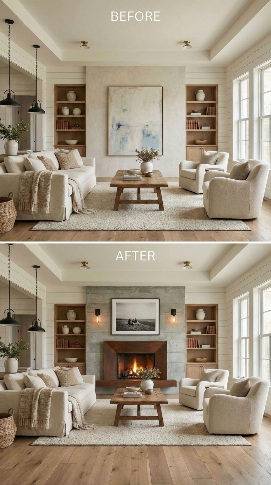 Plain living room accent wall transforms dramatically with the addition of a concrete stone fireplace featuring rich walnut mantel and built-in storage. Black metal sconces flank the new focal point, while warm flames create instant ambiance. The television mounts seamlessly above the mantel, maintaining clean lines while adding functional warmth to this neutral living space.