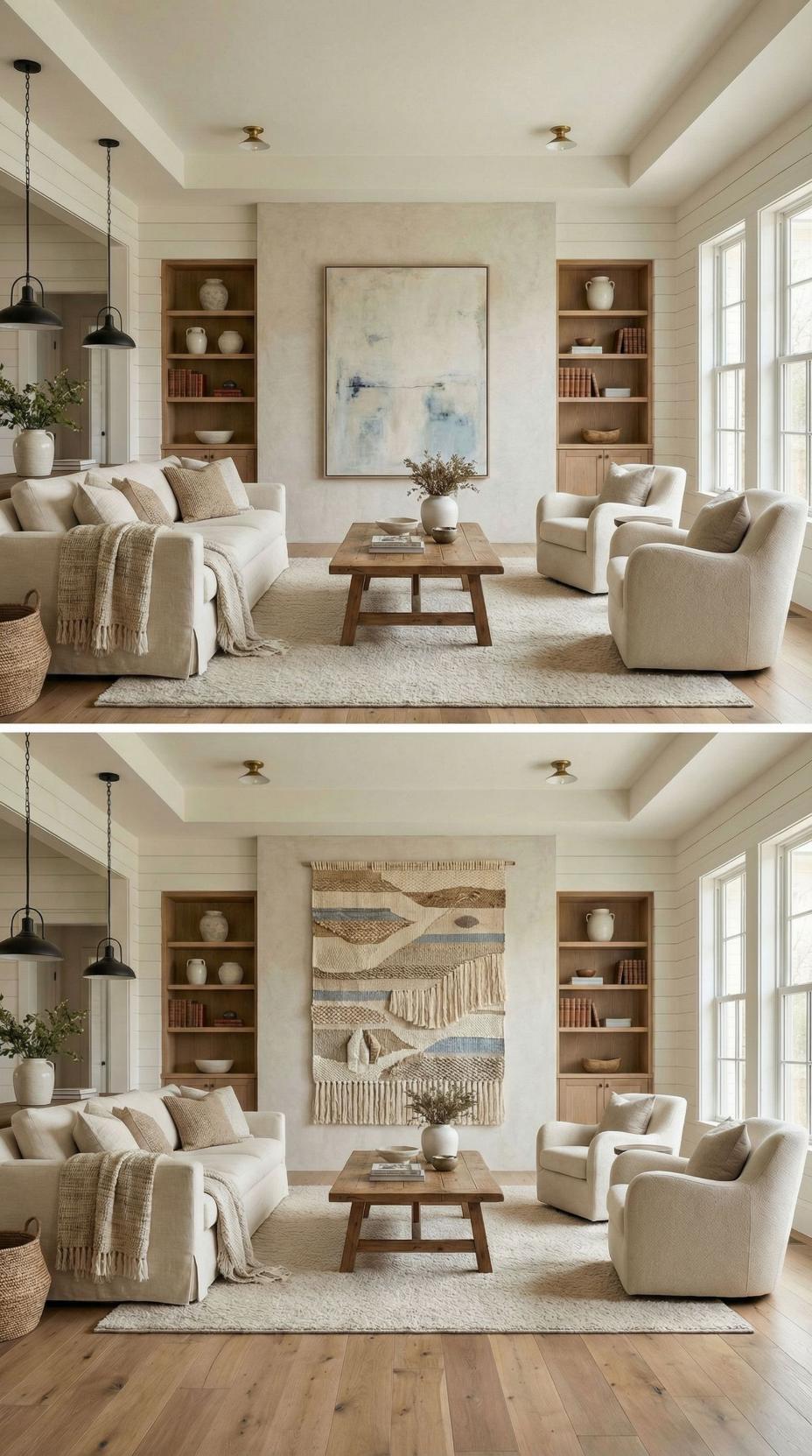 Woven textures and fringe details transform this neutral accent wall from bland to captivating. The large-scale macrame wall hanging introduces organic movement and handcrafted warmth, perfectly complementing the built-in shelving and cream upholstery. Natural fibers in varied weaving patterns create visual depth while maintaining the room’s serene, coastal-inspired aesthetic.