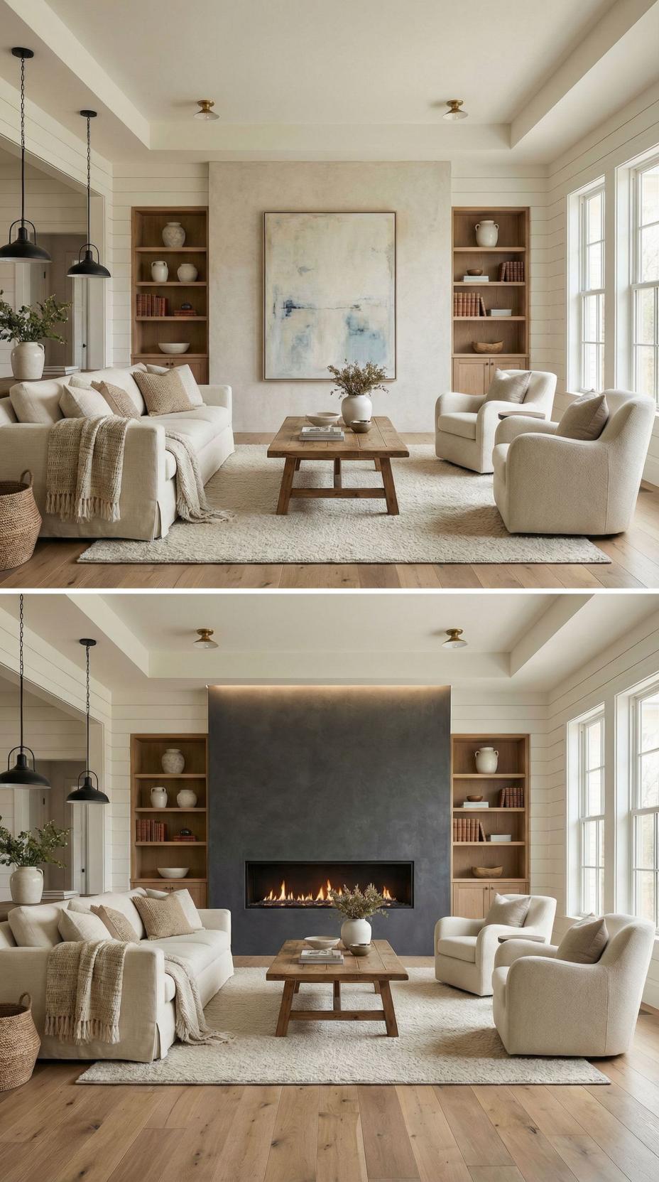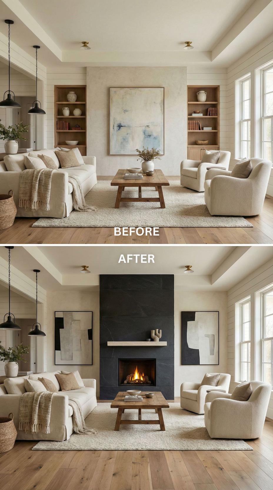 Neutral built-in shelving and subtle artwork transform into a commanding dark stone fireplace that anchors the entire living space. The dramatic slate surround creates instant visual weight and sophistication, while the floating mantel provides perfect styling opportunities. Modern abstract art flanks the fireplace, maintaining the room’s contemporary aesthetic while the original cozy seating arrangement benefits from the new focal point’s warmth and ambiance.