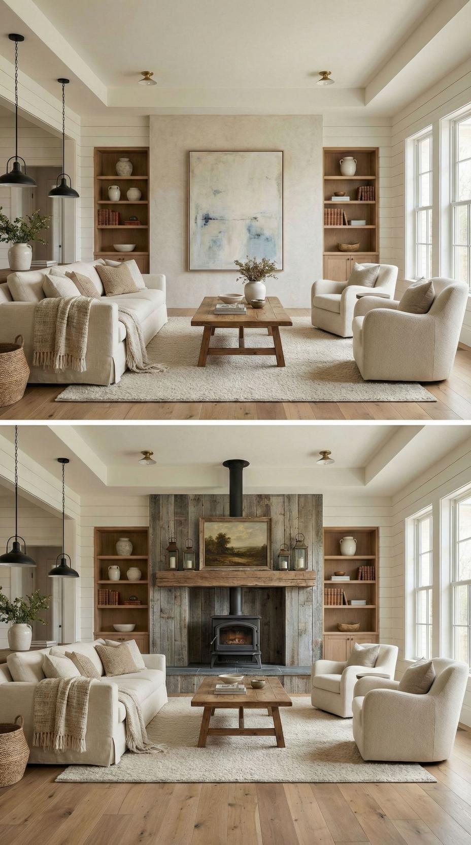 Weathered reclaimed wood planks create a stunning fireplace surround that completely reimagines what was once a plain living room accent wall. The rustic vertical boards frame a black wood-burning stove, while a chunky wooden mantel displays vintage lanterns and traditional artwork. Built-in shelving on both sides maintains the original storage function while complementing the new farmhouse aesthetic with warm wood tones.