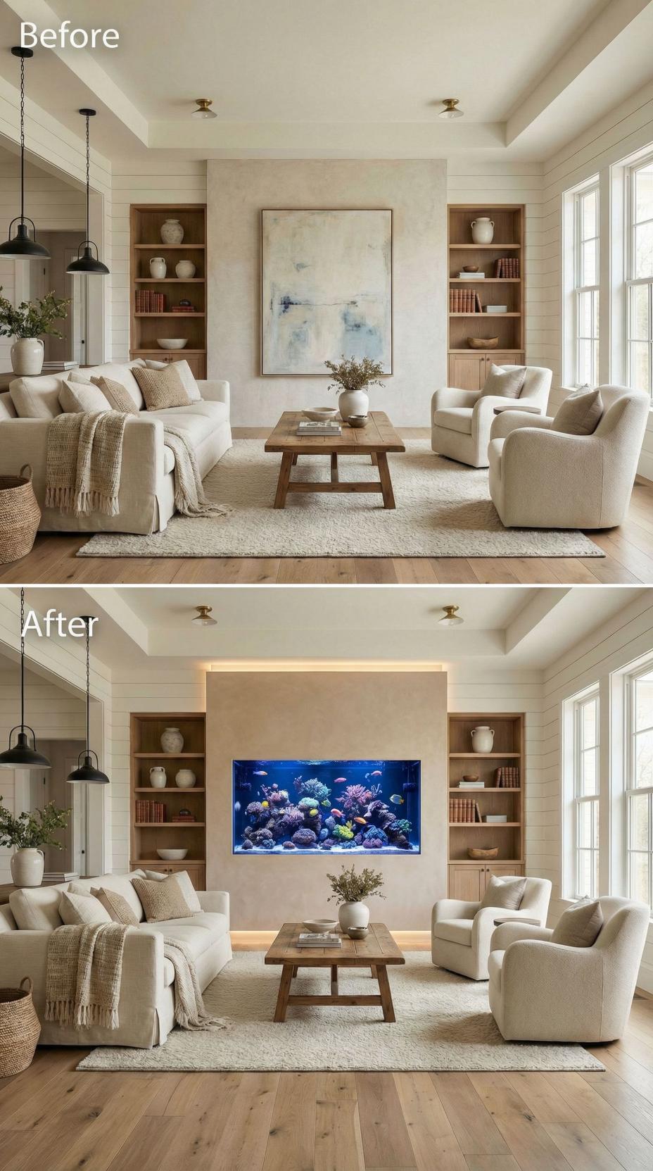 A stunning built-in marine aquarium replaces the plain accent wall artwork, creating a vibrant focal point filled with colorful coral and tropical fish. Integrated LED backlighting frames the aquarium beautifully while maintaining the room’s sophisticated neutral palette. The existing built-in shelving perfectly complements this transformation, making the living space feel like a luxury coastal retreat.