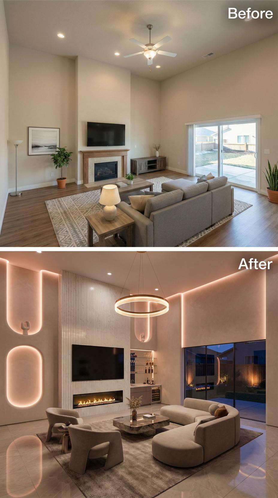 Warm LED strip lighting transforms this builder grade living room into a sophisticated sanctuary with architectural drama. The original ceiling fan and traditional fireplace gave way to a sleek linear gas fireplace and sculptural ring chandelier. Curved sectional seating and illuminated wall niches create an ultra-modern atmosphere, while floor-to-ceiling windows showcase the seamless indoor-outdoor connection.