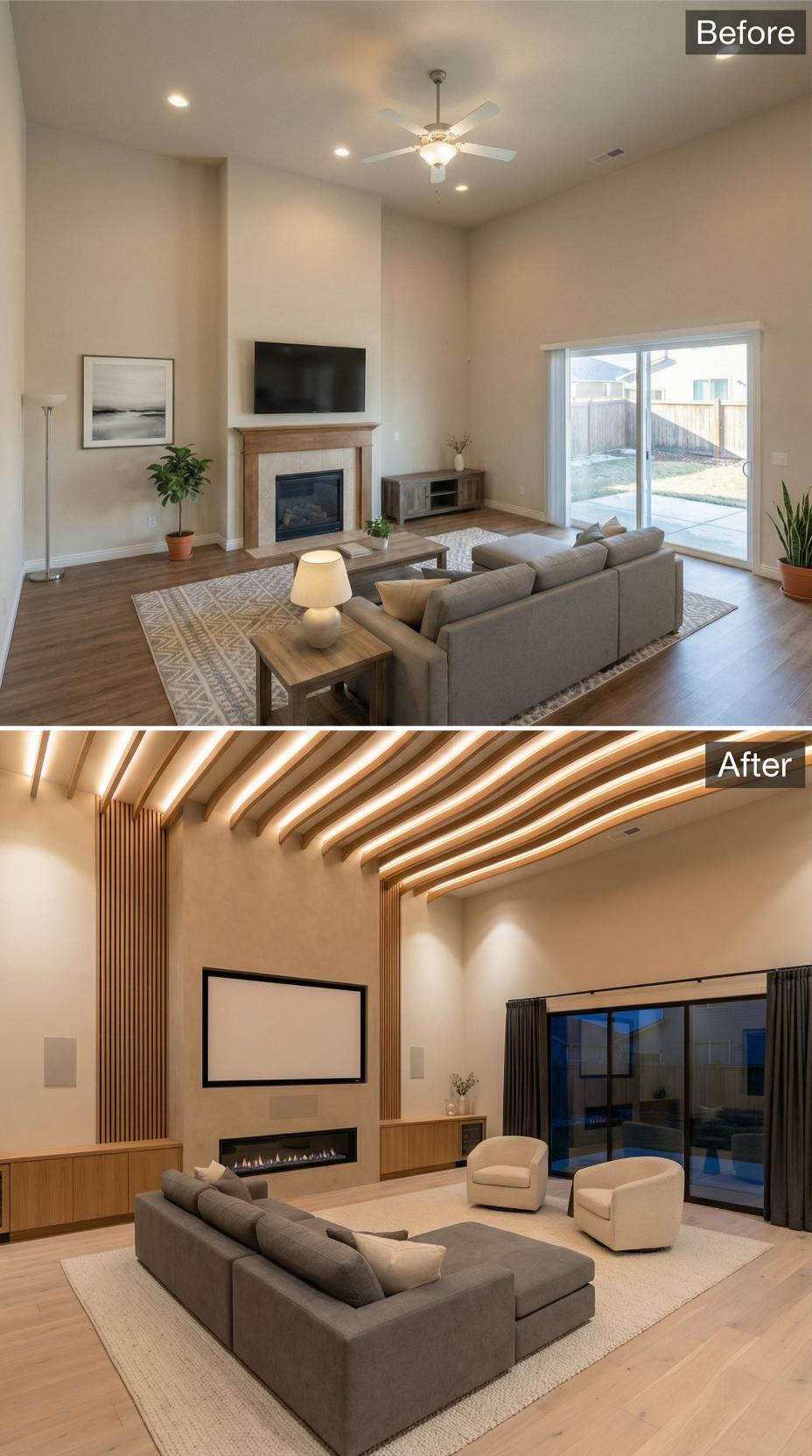 Dramatic wooden slat beams transform this builder grade living room into a sophisticated modern retreat. The ceiling installation creates stunning architectural interest while integrated LED lighting casts warm ambient glow throughout the space. A sleek linear fireplace replaces the traditional hearth, complemented by built-in storage and refined furnishings that elevate the entire room’s luxury quotient.