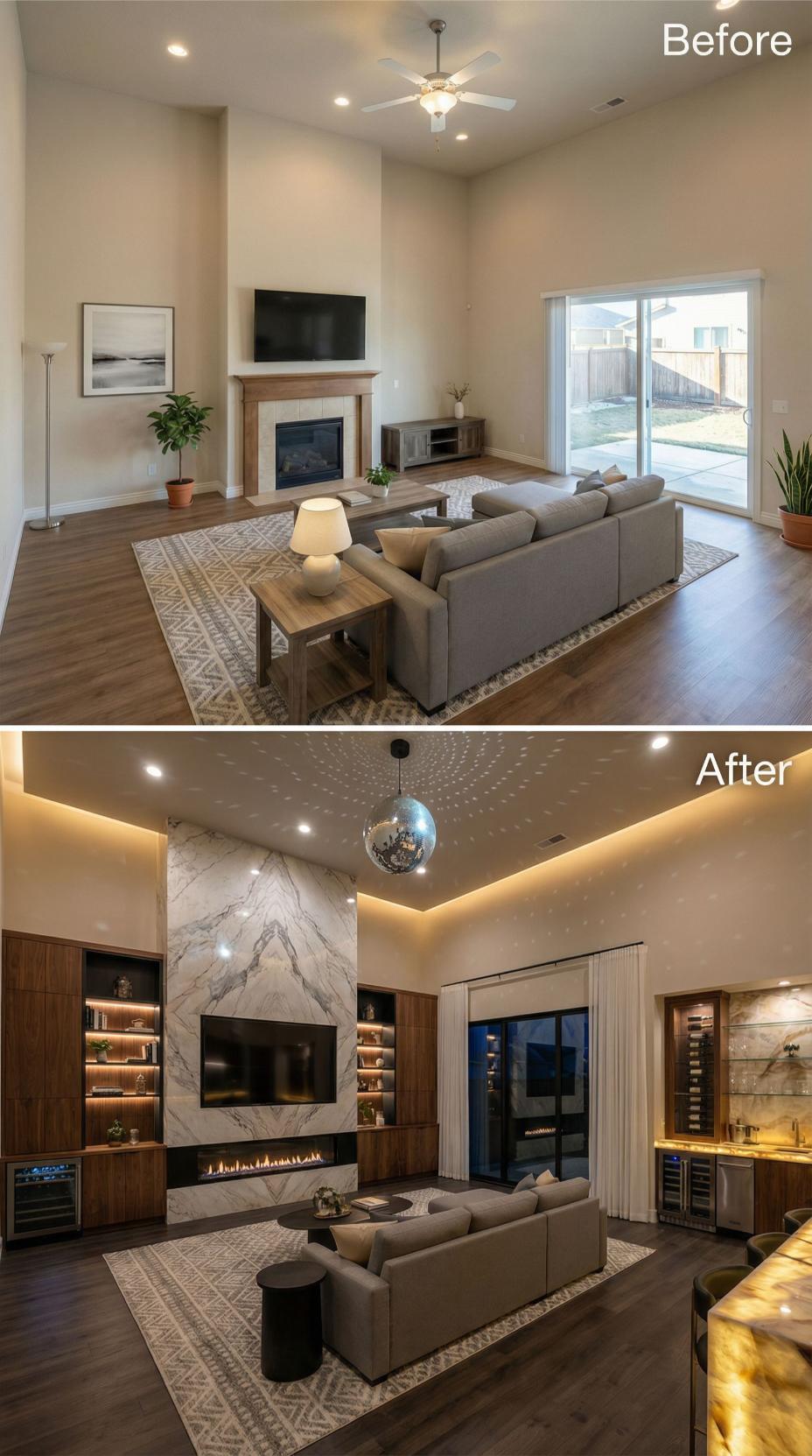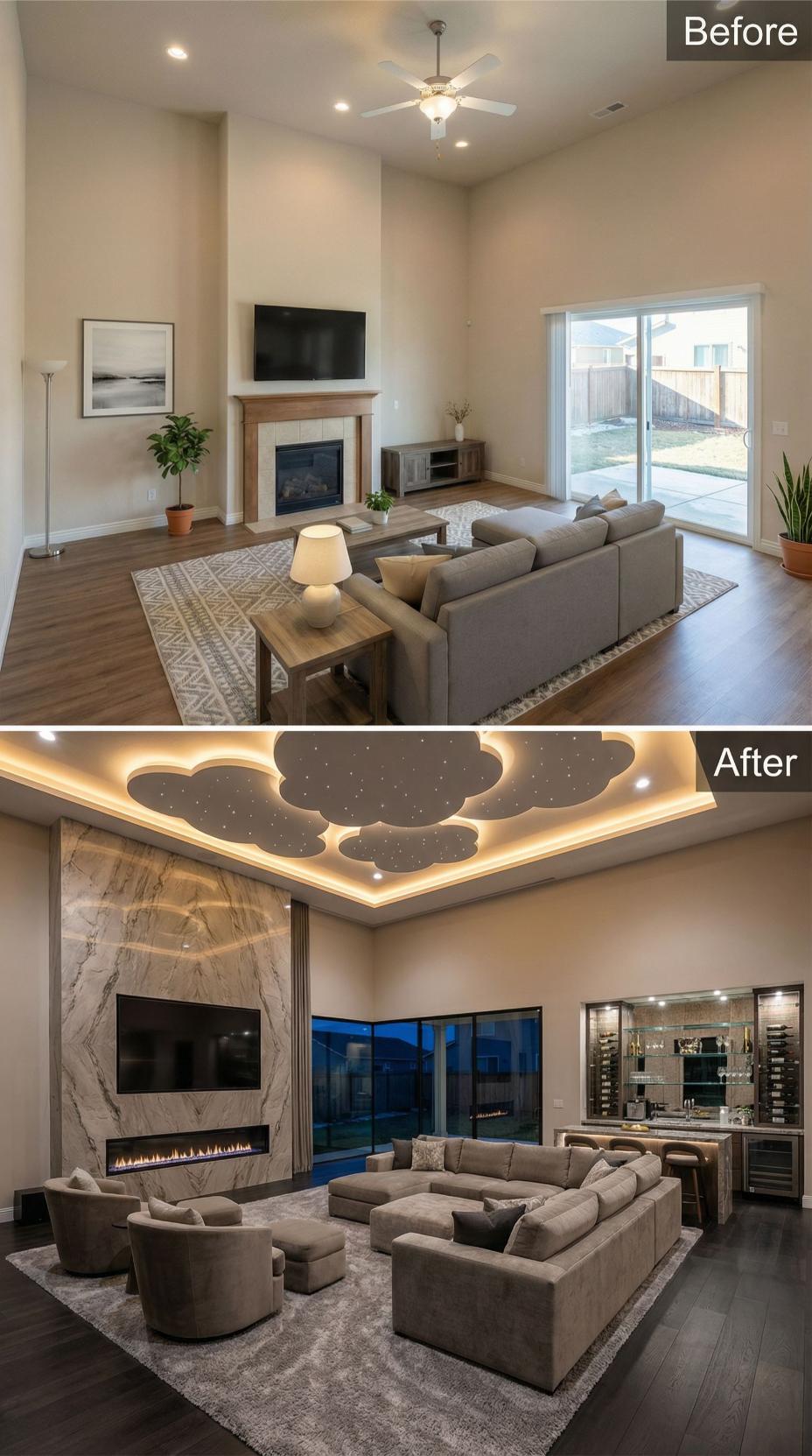 Dramatic ceiling architecture featuring illuminated cloud-like panels transforms this builder grade living room into a sophisticated entertainment haven. The original simple fireplace gives way to a stunning marble statement wall with linear gas insert, while dark hardwood floors replace basic builder finishes. Luxurious sectional seating creates an intimate conversation area, complemented by a full wet bar that elevates the space into the ultimate hosting destination.