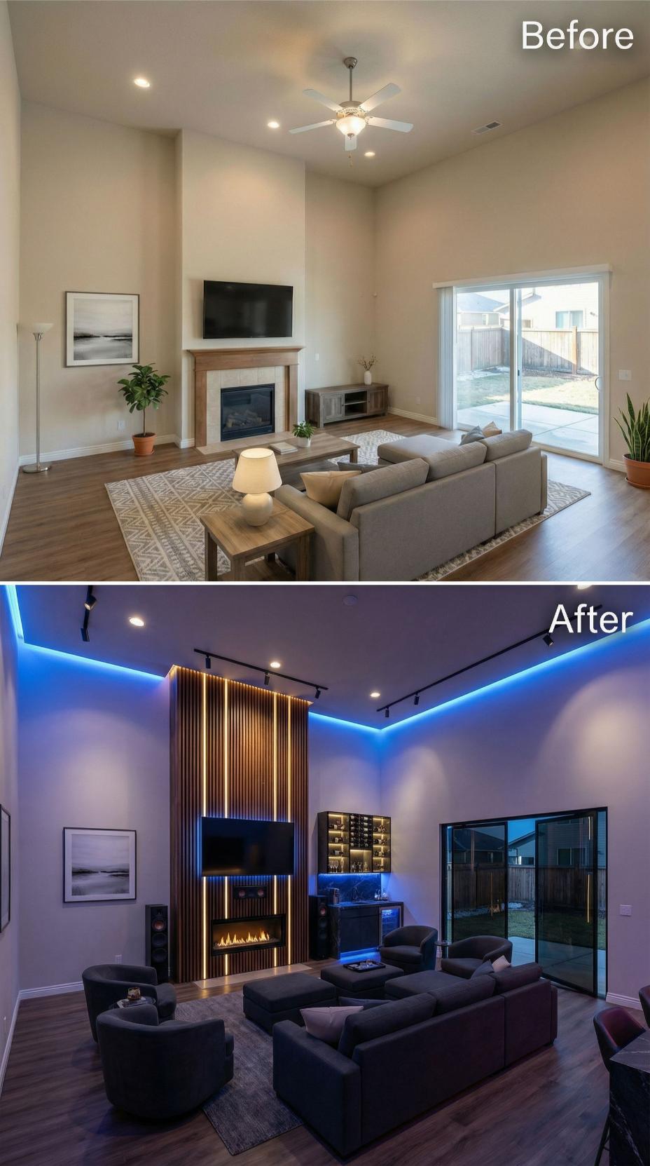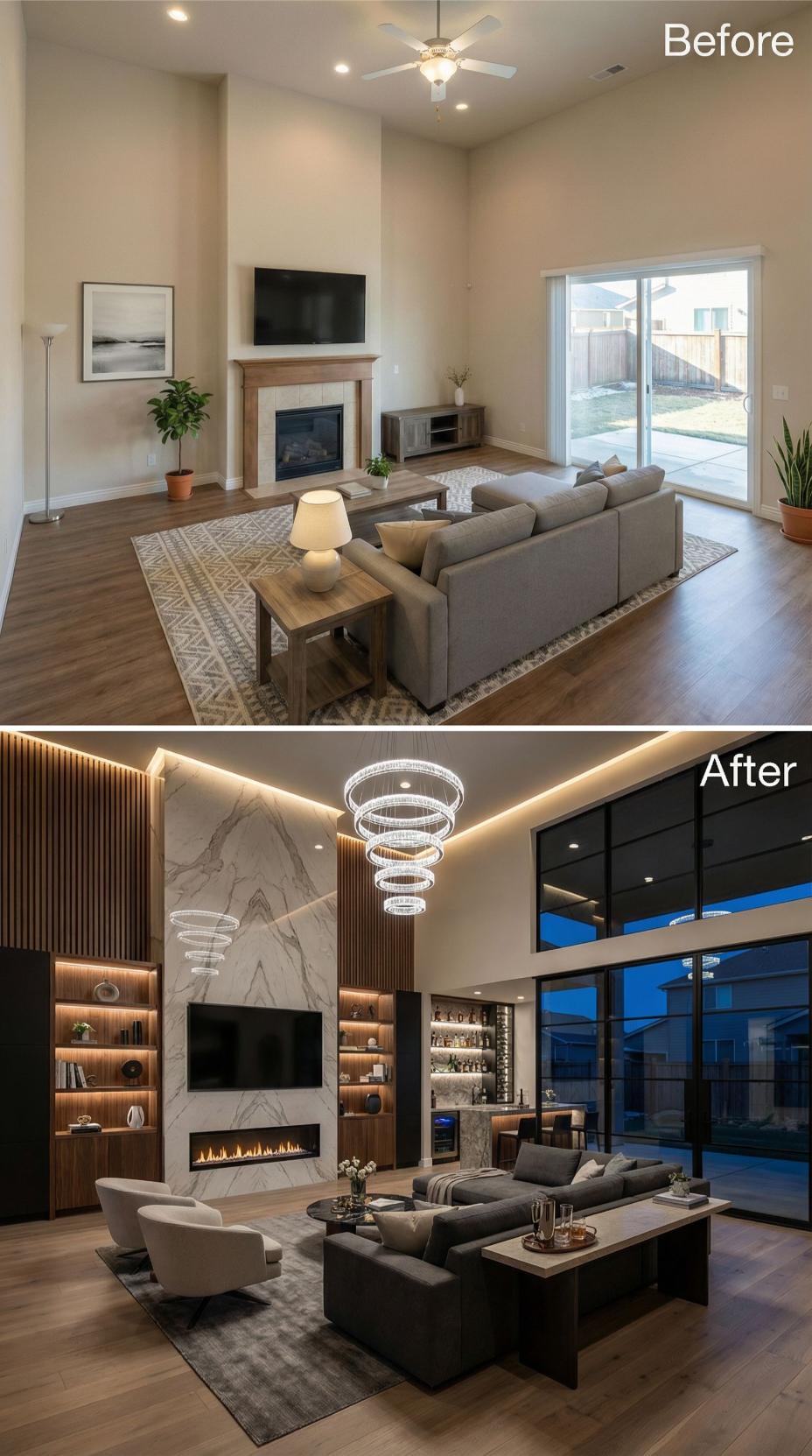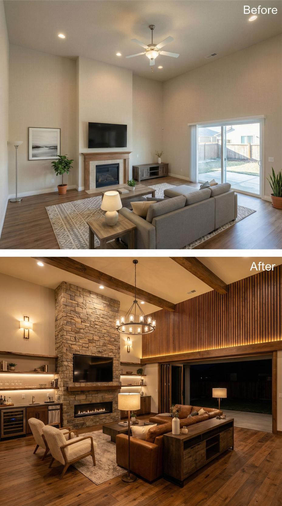 Dramatic architectural upgrades transform this builder grade living room into a stunning contemporary showcase. The original basic fireplace gives way to a striking stone accent wall with vertical wood slats, while modern LED strip lighting replaces the standard ceiling fan. Luxurious finishes, a sleek linear fireplace, and an integrated entertainment center create an upscale retreat that feels like a high-end resort.