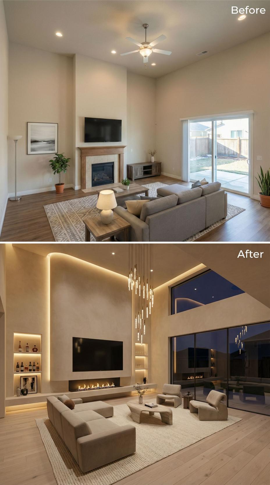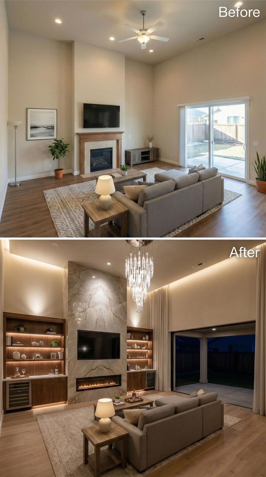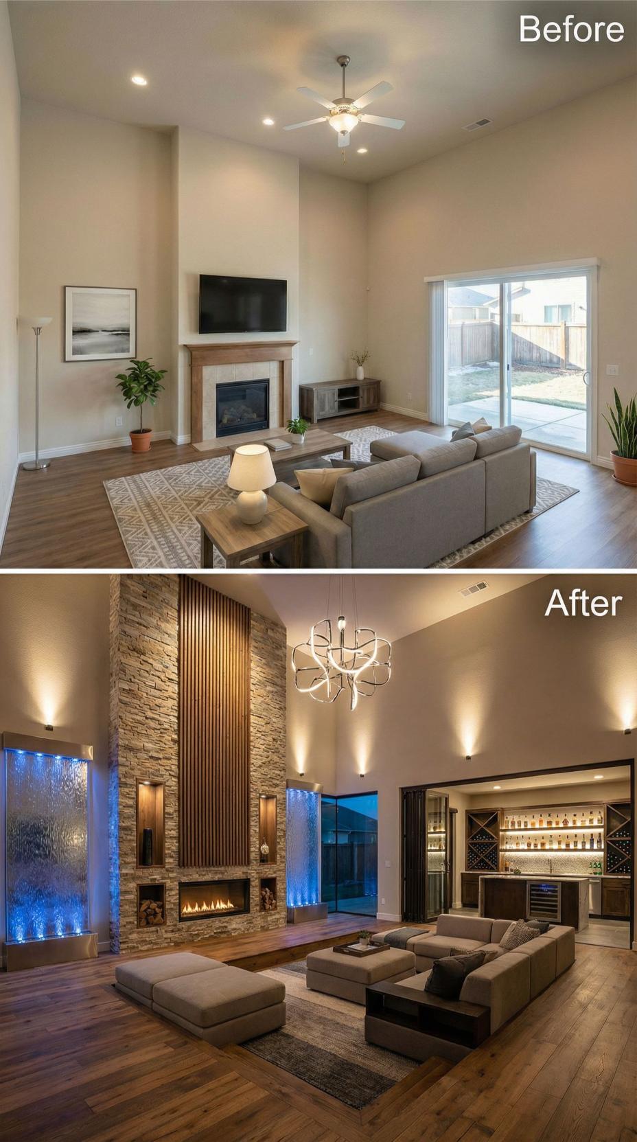 Dramatic architectural upgrades transform this builder grade living room into a stunning contemporary showcase. The original basic fireplace gives way to a striking stone accent wall with vertical wood slats, while modern LED strip lighting replaces the standard ceiling fan. Luxurious finishes, a sleek linear fireplace, and an integrated entertainment center create an upscale retreat that feels like a high-end resort.