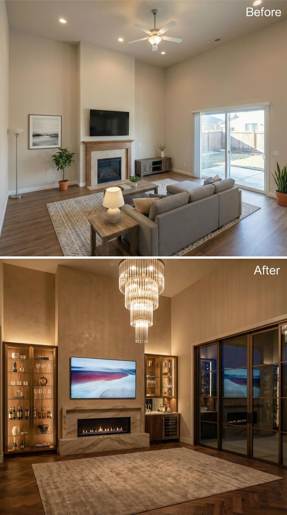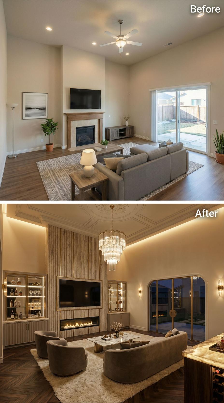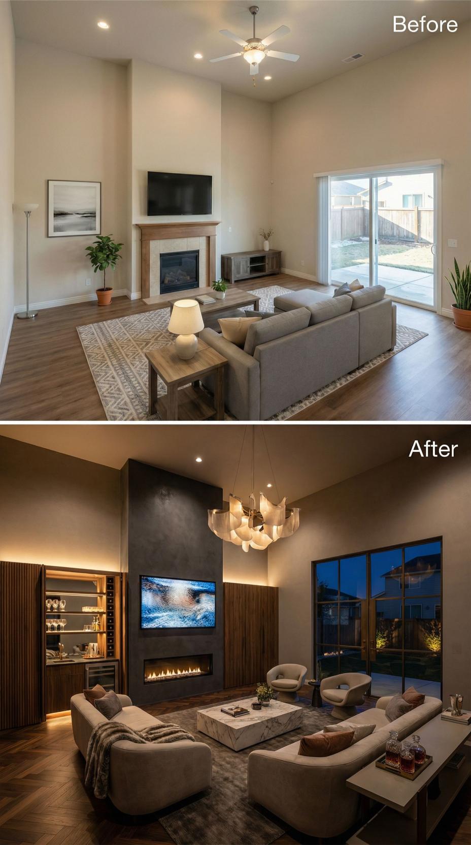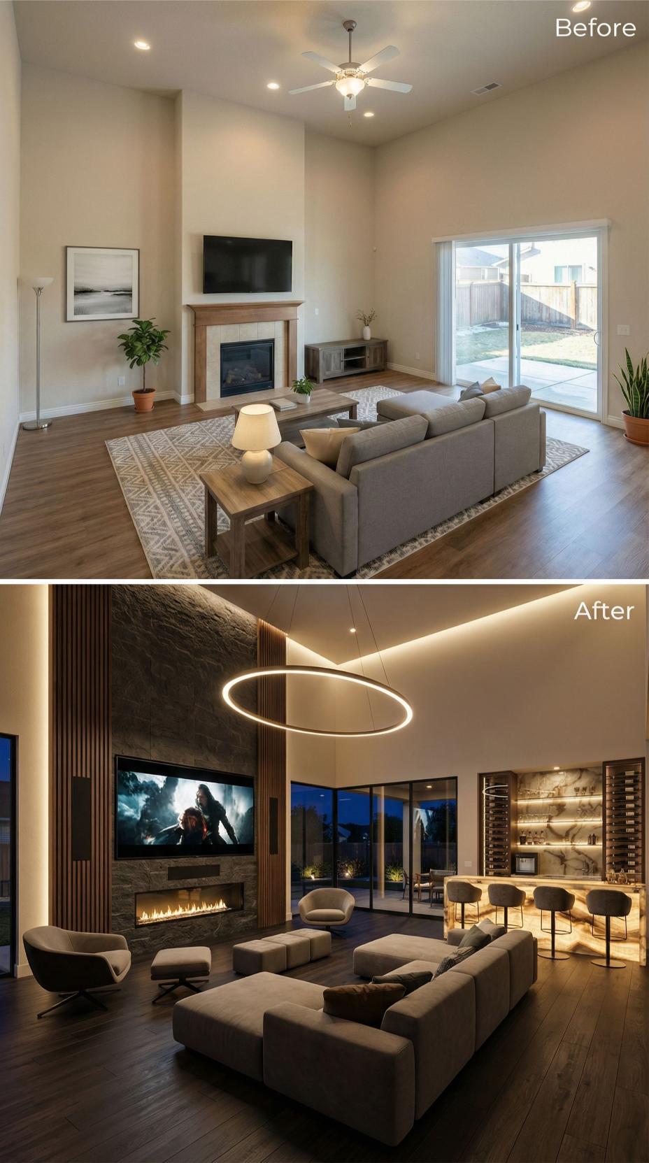 Warm wood paneling and sleek built-ins replace the simple fireplace surround, creating a stunning media wall that anchors this transformed space. The original gray sectional finds new purpose alongside curved accent chairs, while dramatic lighting from the sculptural chandelier and integrated LED strips elevates the entire atmosphere. Rich textures and a sophisticated color palette complete this remarkable evolution from standard to spectacular.