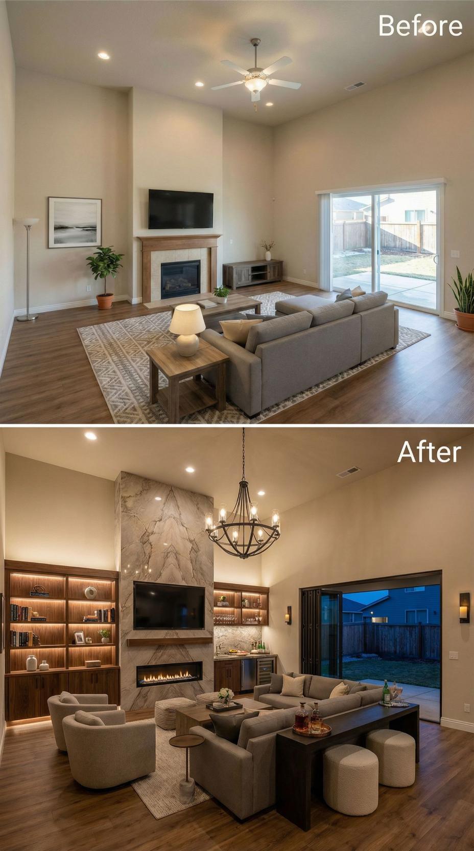 Stunning built-in cabinetry with floating shelves transforms this builder grade living room into an architectural masterpiece. The dramatic marble fireplace surround creates a bold focal point, while warm wood cabinets and pendant lighting add sophisticated layers. Modern furniture arrangement and curated accessories complete the luxurious transformation from generic space to designer showroom.