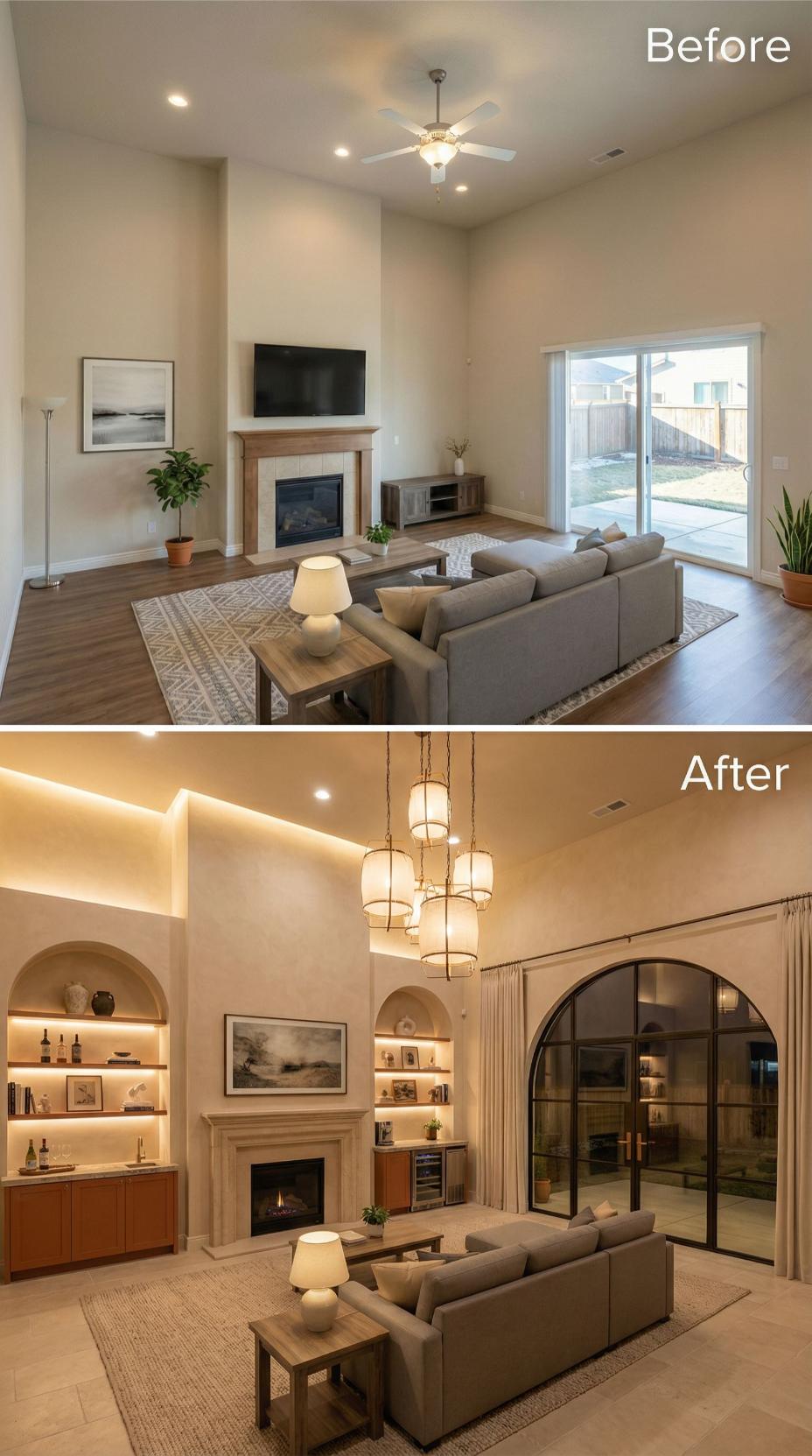 Dramatic architectural elements transformed this builder grade living room into a sophisticated Mediterranean retreat. Custom arched built-ins with warm LED lighting replaced basic walls, while an elegant multi-light pendant chandelier upgraded the standard ceiling fan. Rich walnut cabinetry, textured plaster walls, and carefully curated shelving displays create layers of visual interest that elevate the entire space from ordinary to extraordinary.