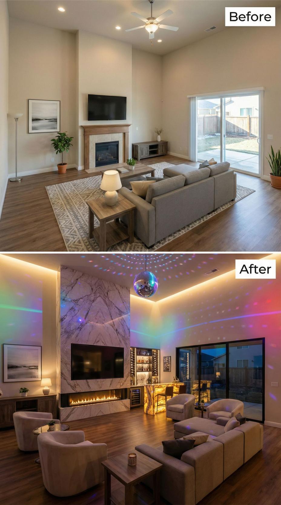 Dramatic ambient lighting transforms a standard builder grade living room into an electrifying entertainment haven. The original basic fireplace receives a stunning marble surround upgrade, while LED strip lighting creates a luminous ceiling perimeter. A mirrored disco ball replaces the mundane ceiling fan, casting prismatic reflections throughout the space. Built-in bar storage and colorful wash lighting elevate this once-plain room into a sophisticated party destination.