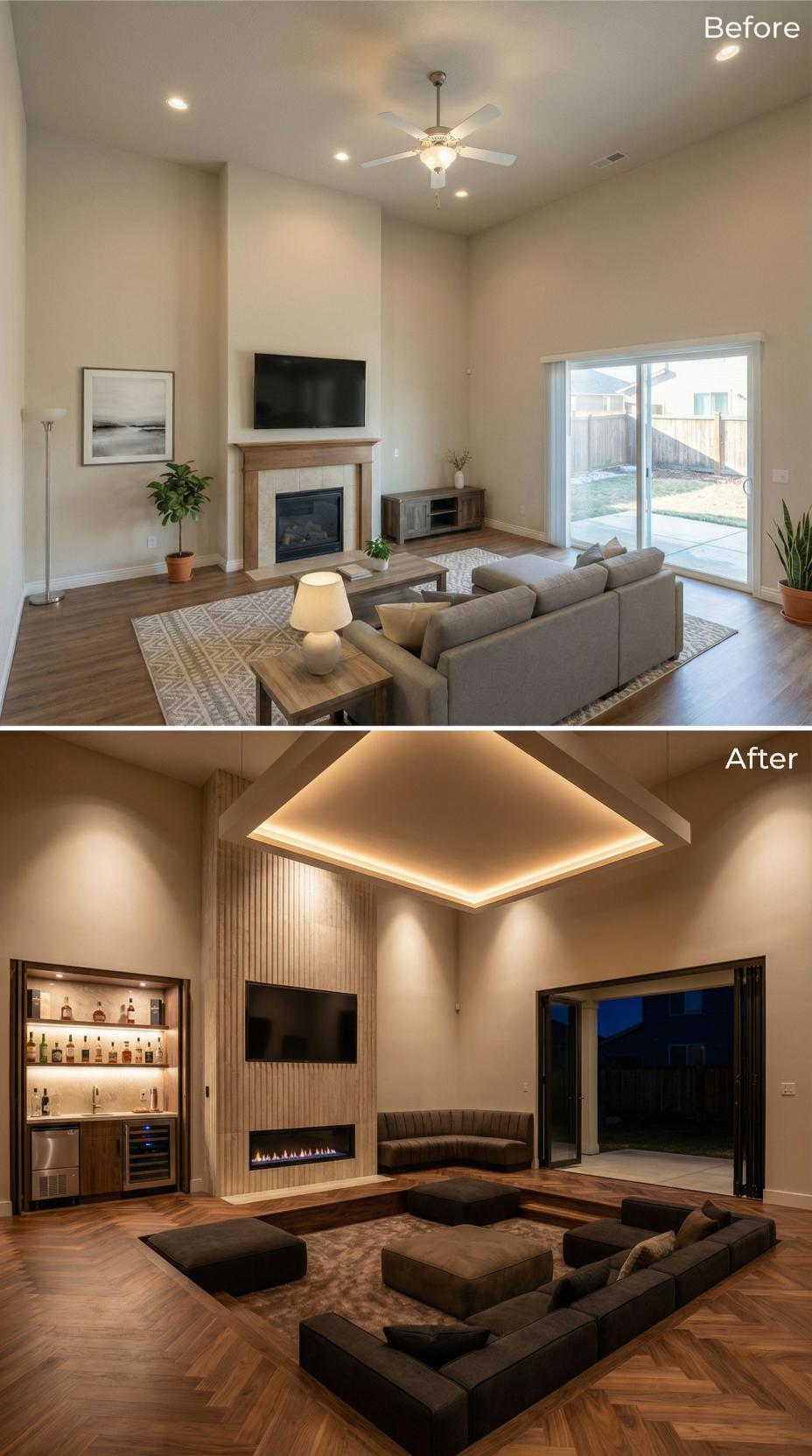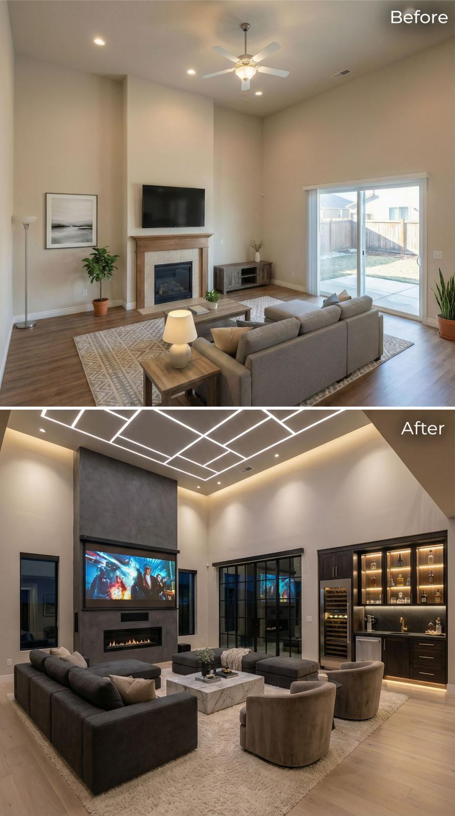 Dramatic architectural ceiling details and sophisticated lighting transform this builder grade living room into a high-end entertainment haven. The renovation introduces a striking geometric ceiling feature with integrated LED strip lighting, while a sleek linear fireplace replaces the traditional unit. Rich dark cabinetry creates a luxurious wet bar area, and the furniture arrangement shifts to accommodate both intimate conversation and media viewing in this elevated space.