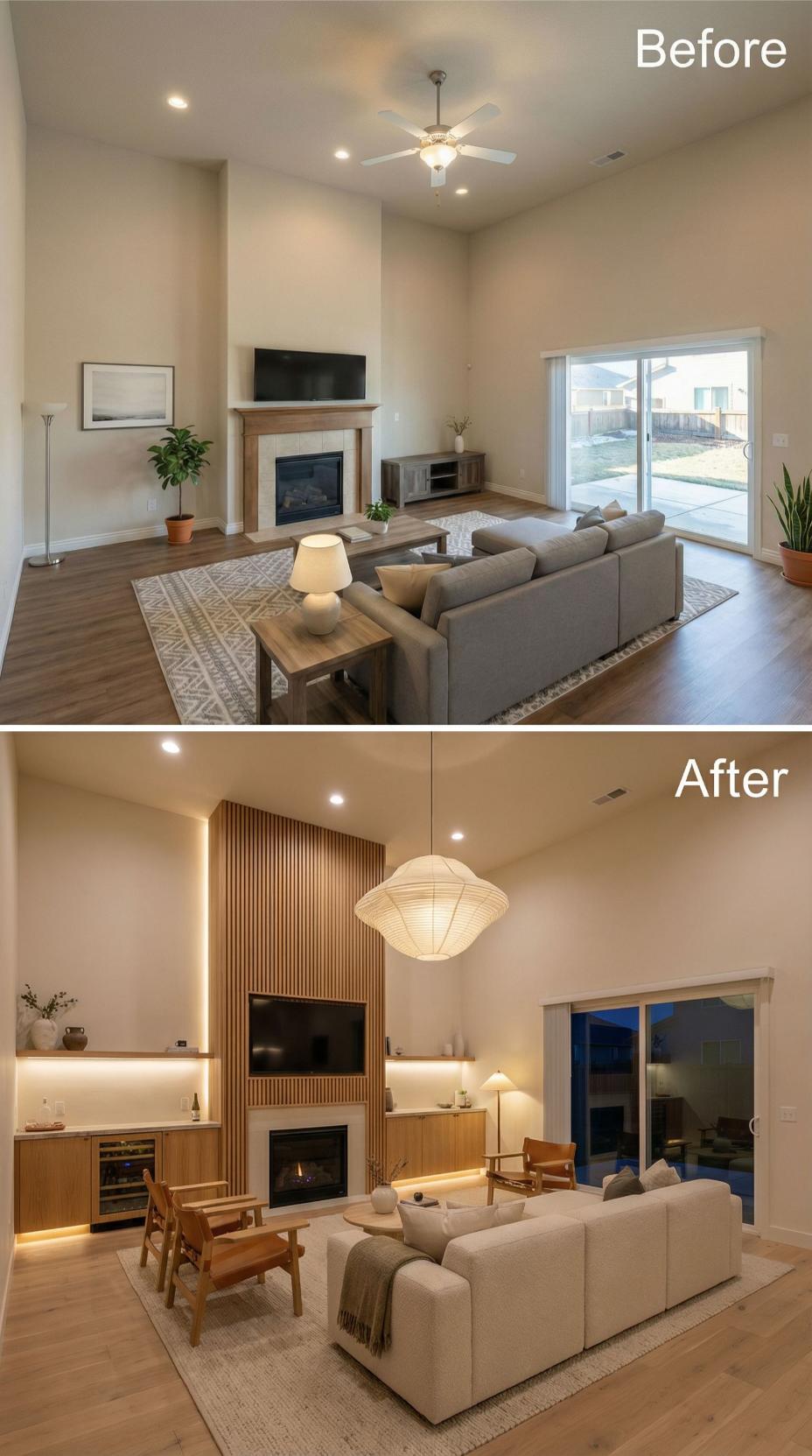 Vertical wood slat paneling transforms the plain fireplace wall into a stunning focal point, while integrated LED strip lighting creates ambient warmth throughout the redesigned space. The ceiling fan disappears in favor of a sculptural woven pendant light, and built-in cabinetry replaces the awkward corner TV stand. Mid-century furniture and layered lighting complete this sophisticated transformation from cookie-cutter builder grade living room.